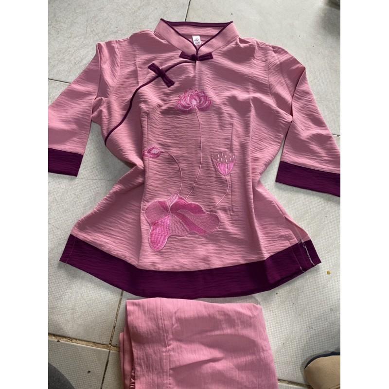 quần áo Phật tử cổ tàu cài chéo - đồ lam đi chùa Sen Hồng - set Phật tử nữ đẹp 0898553583