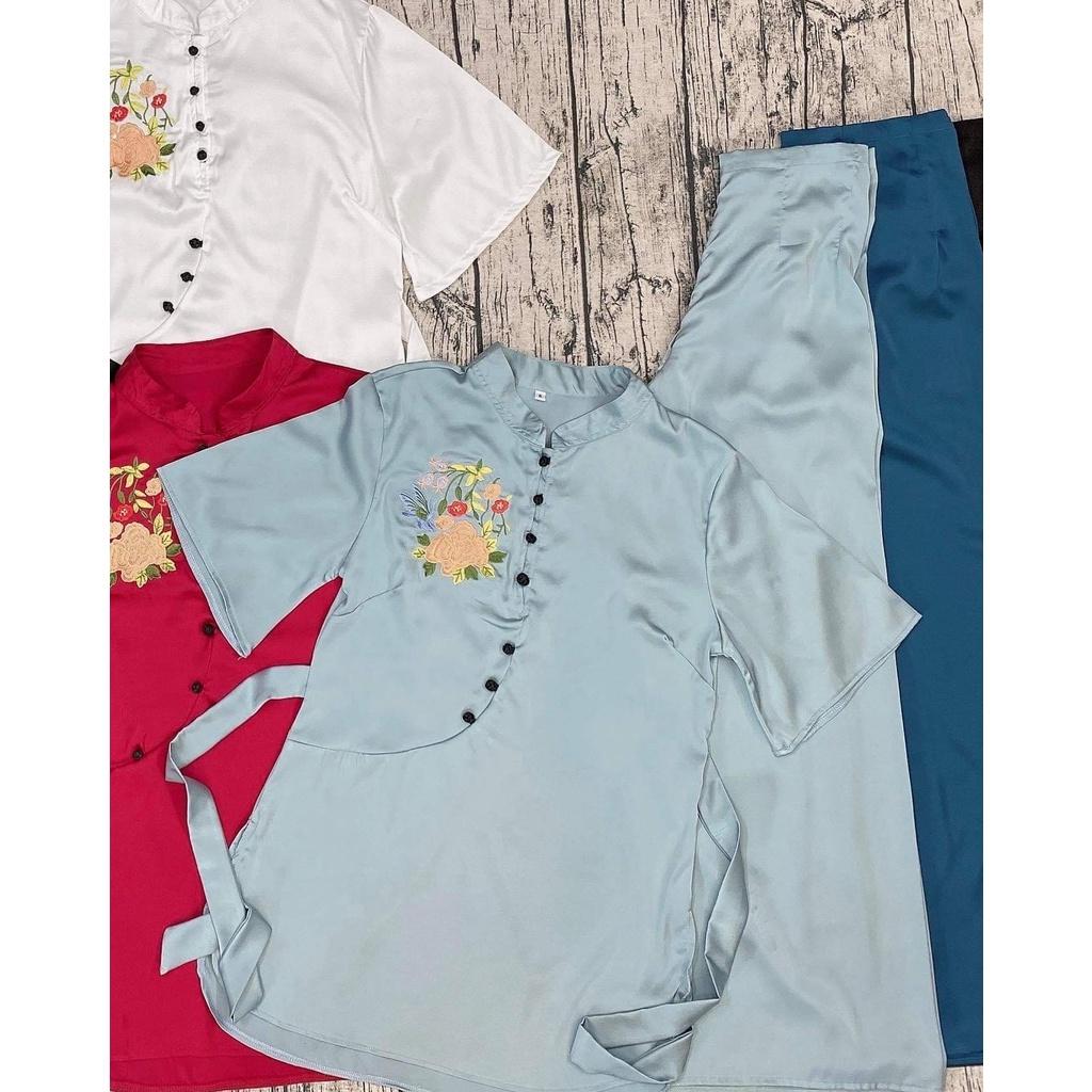 Đồ lam đi chùa lụa gấm - bộ quần áo Phật tử lụa vân hoa cỏ xinh xắn - pháp phục nữ cổ tàu cài chéo