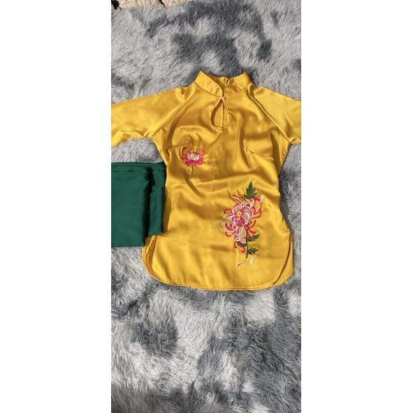 đồ lam đi chùa nữ thêu hoa Cúc cổ V vải đũi thái, Pháp phục lễ chùa, hoa bỉ ngạn