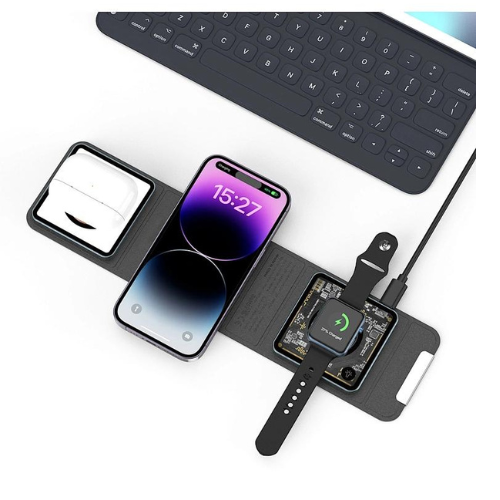 -  Sạc 3 trong 1 sạc cùng lúc iP, Ap Watch, AirP tiện lợi -  Công nghệ Qi2 MagS tương thích iP 12, 13, 14, 15 sạc nhanh hơn -  Sạc không dây 15W tối ưu tốc độ sạc an toàn, hiệu quả -  Thiết kế nam châm mạnh hít chặt, giữ thiết bị cố định chắc chắn -  Gập gọn siêu di động dễ dàng mang theo, tiện lợi khi di chuyển