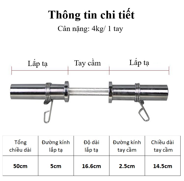 *THÔNG TIN CHI TIẾT VỀ ĐÒN TẠ TAY 50CM PHI 50 ĐẠI NAM SPORT. -Thương hiệu: Đại Nam Sport - Chất liệu: Thép đặc mạ inox - Chiều dài: 50cm - Đường kính lắp tạ: