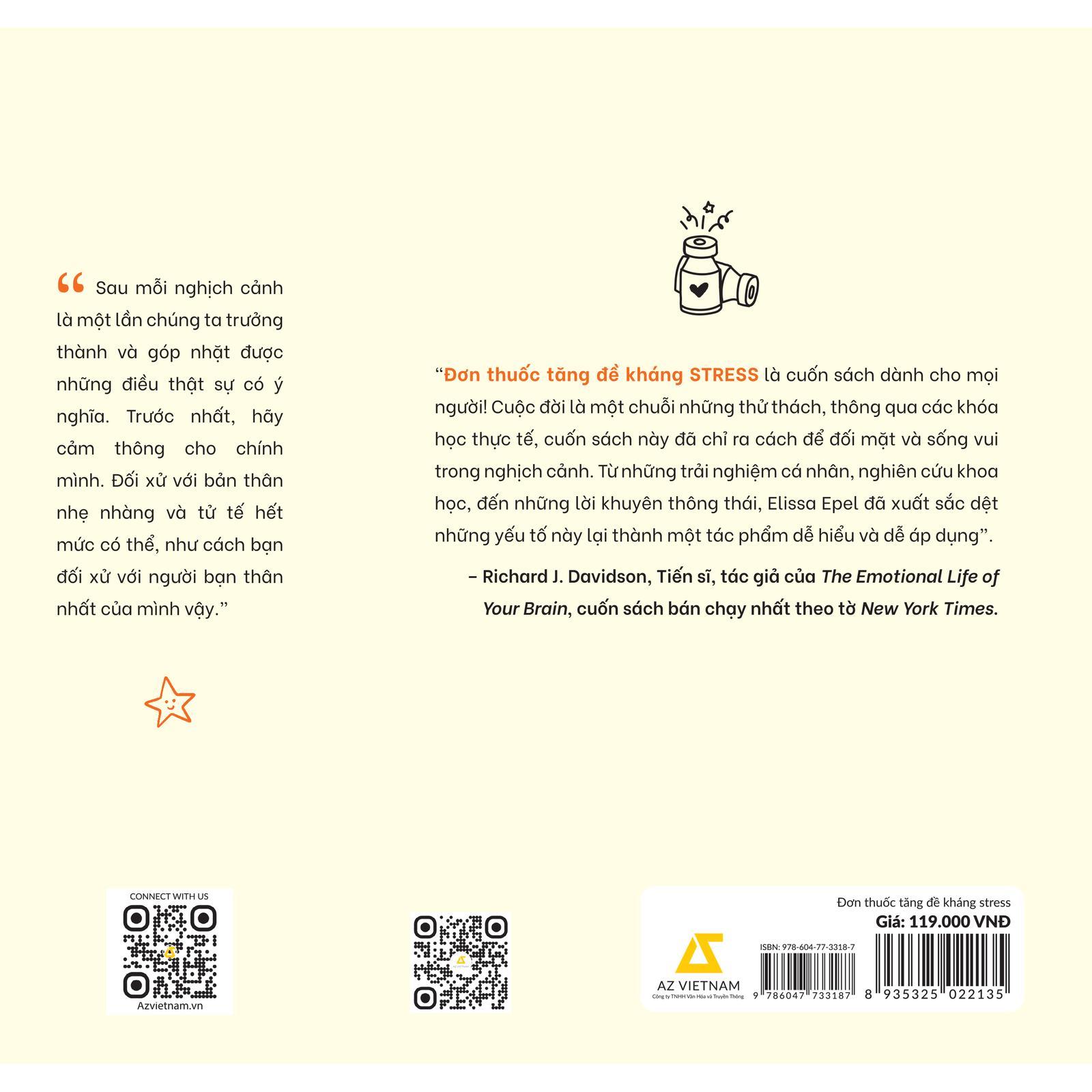 Trong cuốn sách Đơn thuốc tăng đề kháng stress, Giáo Sư, Tiến sĩ Elissa Epel đã đúc kết những cách để ứng phó với stress từ kinh nghiệm của bản thân cũng như những nghiên cứu khoa học. Đọc cuốn sách này, bạn sẽ biết giữ mối quan hệ với stress ở khoảng cách vừa đủ, cách xa những lo âu sợ hãi, ít áp lực và khỏe khoắn hơn cả về thể chất lẫn tinh thần.