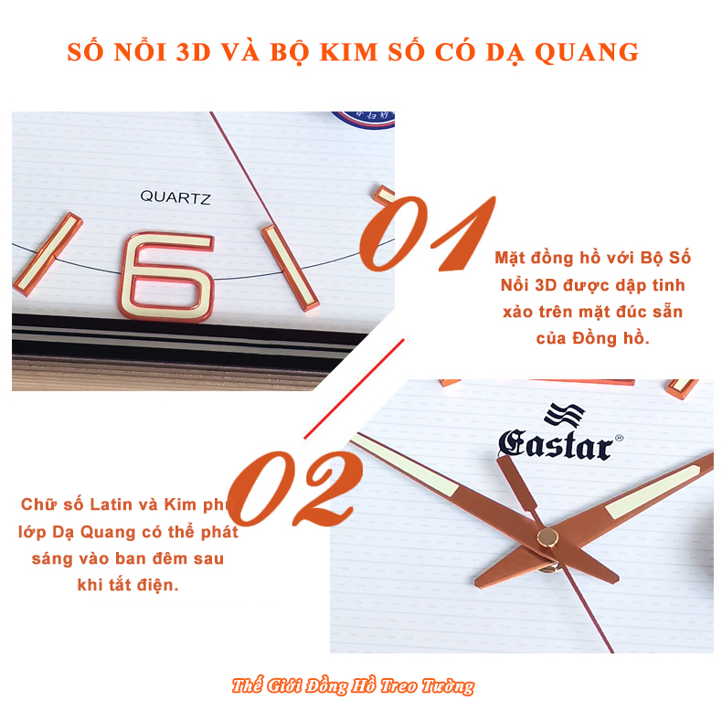 1. ĐẶC ĐIỂM NỔI BẬT: - Đồng hồ Cao Cấp EASTAR kiểu dáng hiện đại với đường kính lên tới 32,5 cm, dày 4,5 cm. - Bộ Kim và số nổi 3D có Dạ Quang
