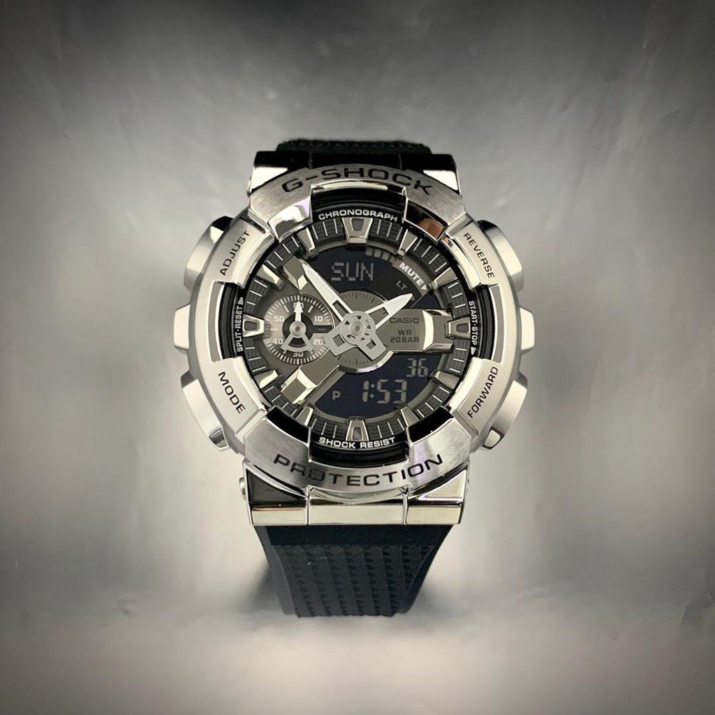 Mẫu GM-110 có gờ và mặt số màu bạc mang lại diện mạo kim loại.