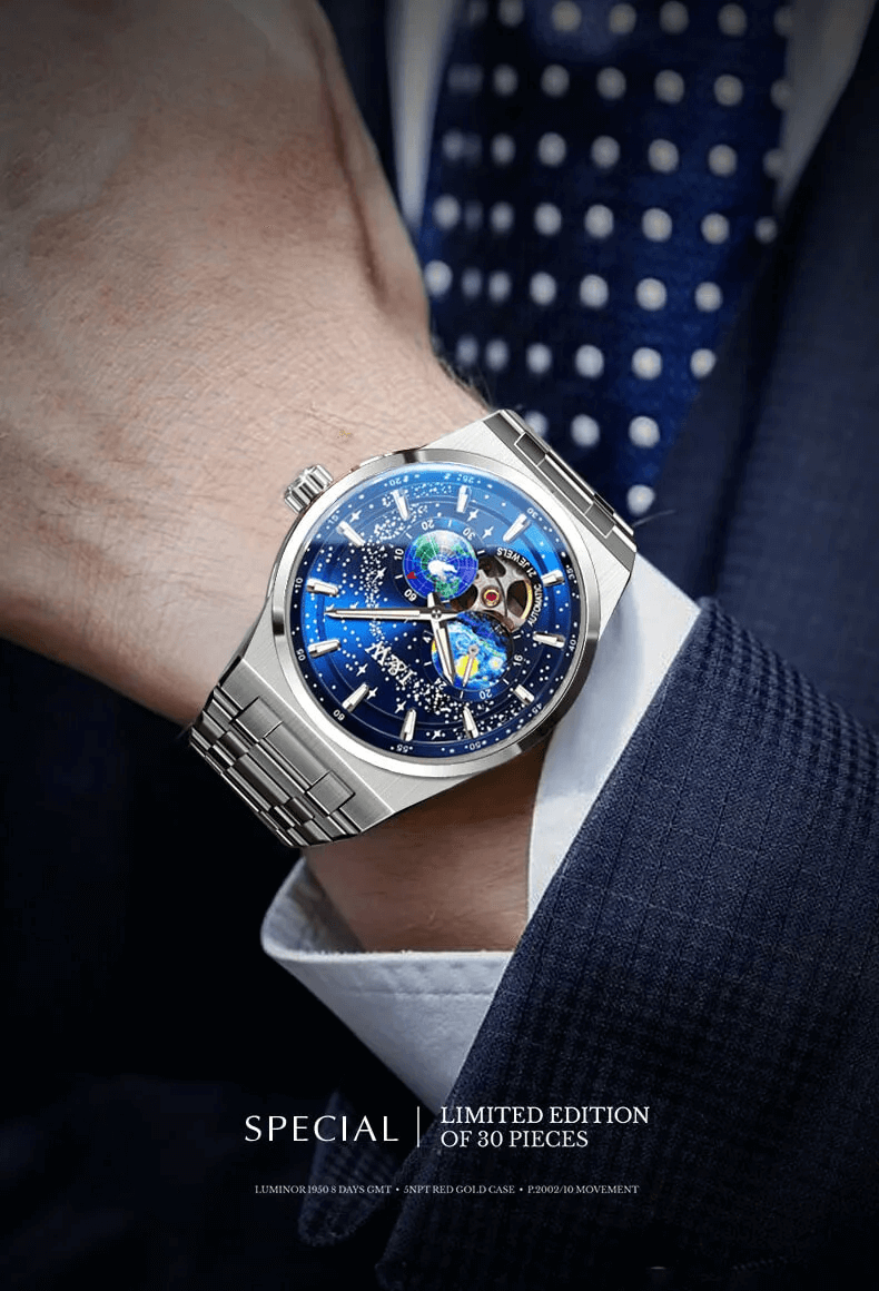 Sự kết hợp hoàn hảo đến khó tin của mặt dial vạn vì sao lấp lánh như bầu trời trong đêm cùng với sự sáng tạo kim giây mô phỏng vòng quay của Trái Đất không ngừng nghỉ (đặc sắc hơn với dạ quang siêu sáng ban đêm)