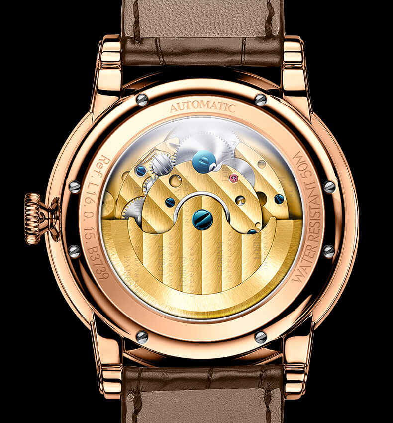 Cỗ máy cơ IN-HOUSE thiết kế HỞ HOÀN TOÀN MẶT SAU để người dùng cảm nhận từng chuyển động trong bộ máy tinh xảo của Lobinni sản xuất