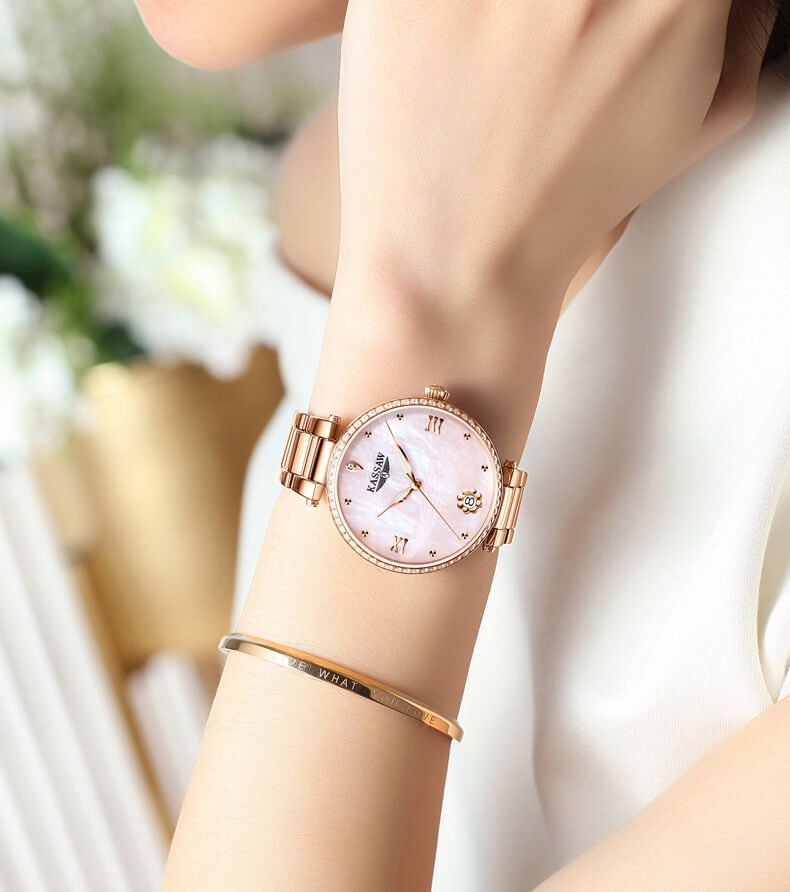 Đồng hồ nữ chính hãng kassaw Thụy Sỹ Thiết kế hiện đại,sang trọng dành cho phái nữ Thời gian trữ cót lâu lên đến 40h Chống nước 5ATM, Kính sapphire Toàn bộ máy được làm
