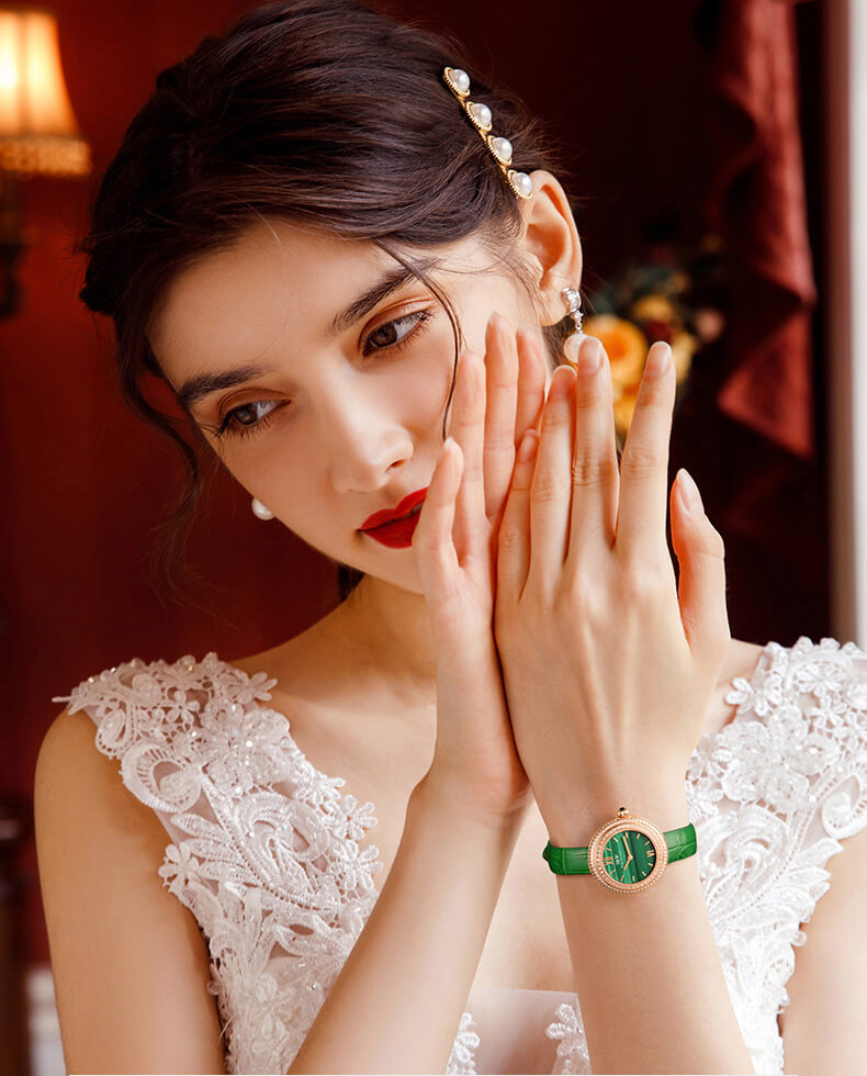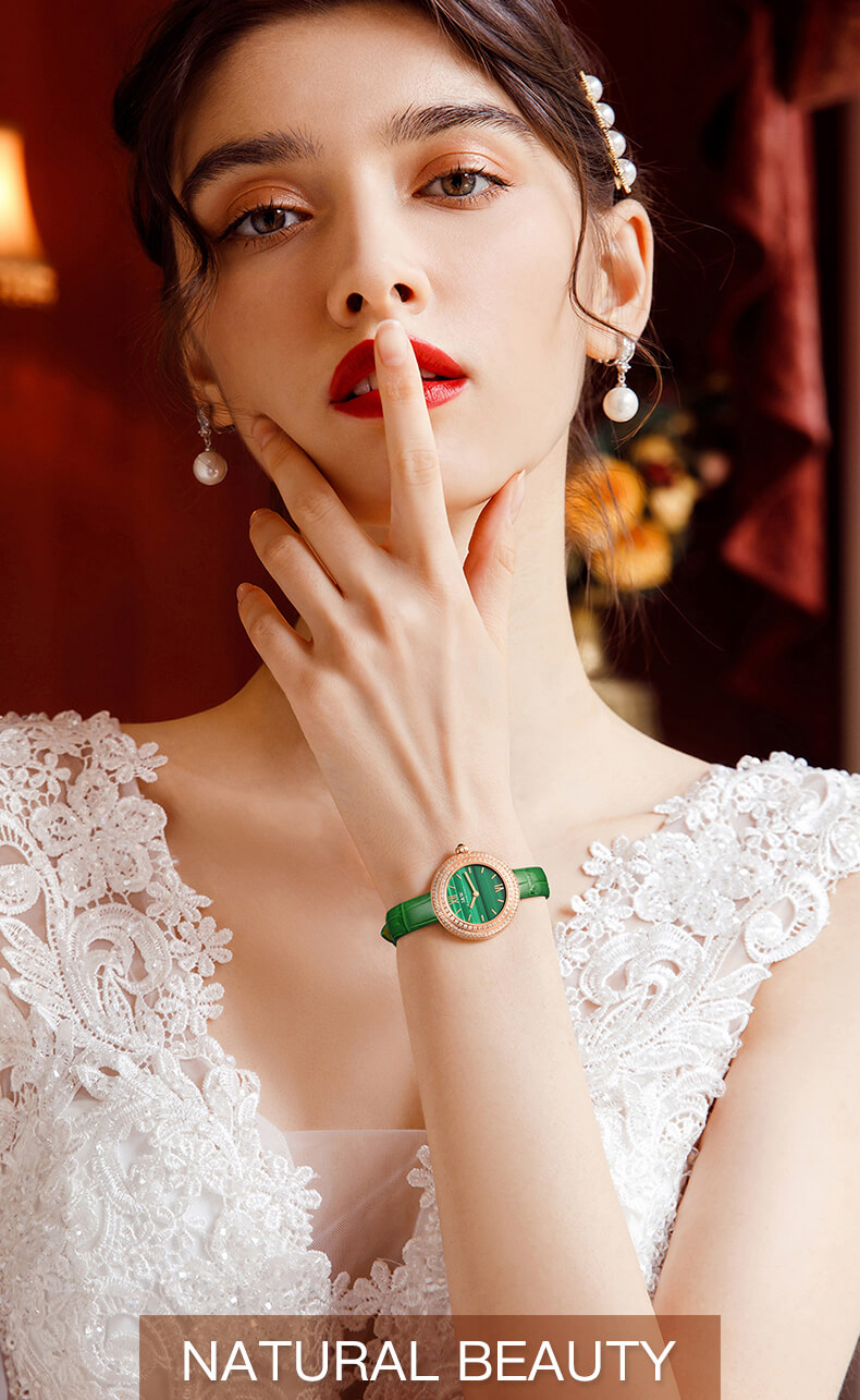 - Phong cách thiết kế Dress watch với mặt đồng hồ ngọc trai.