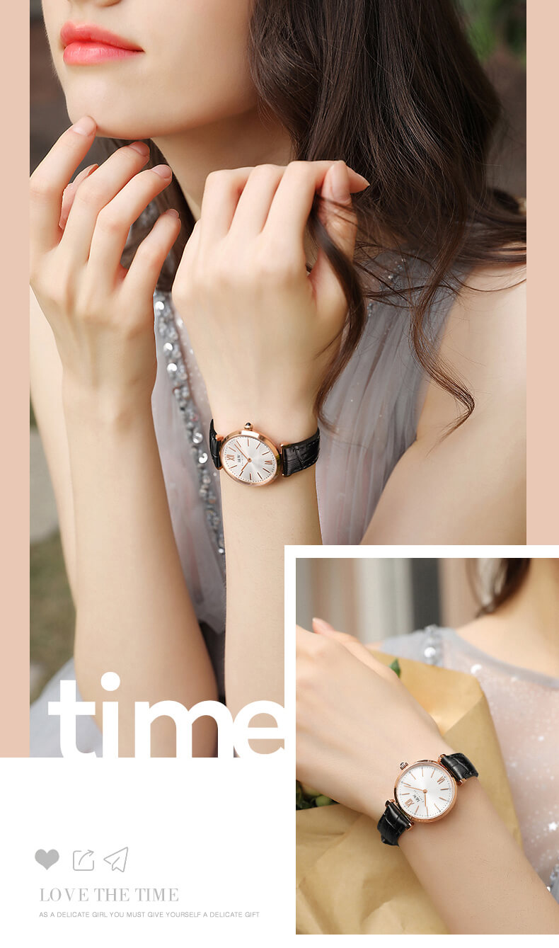 Chiếc đồng hồ thích hợp với các bạn nữ yêu thích sự trẻ trung, quyến rũ và với thiết kế nhỏ nhắn nhẹ nhàng cho nữ giới dây da tối màu giúp bạn dễ phối