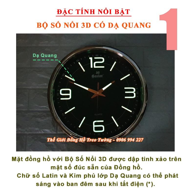 • Bộ Kim và mặt số nổi 3D có Dạ quang (*) phát sáng trong đêm tối sau khi tắt điện giúp nhận biết thời gian dễ dàng.