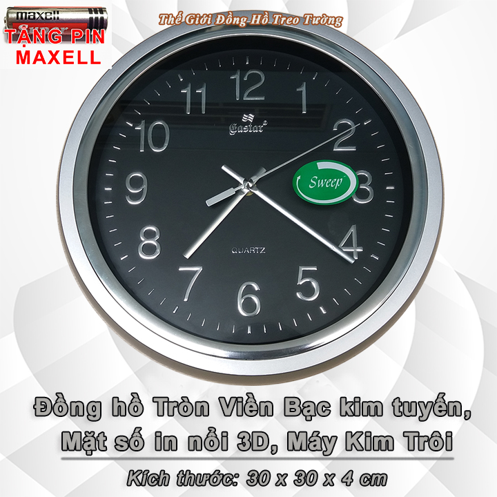 ✨Đồng Hồ Treo Tường KIM TRÔI EASTAR Cao Cấp Mặt Tròn Viền Bạc Kim Tuyến - Mặt số in Nổi 3D - Máy Kim trôi – Kèm Pin Maxell