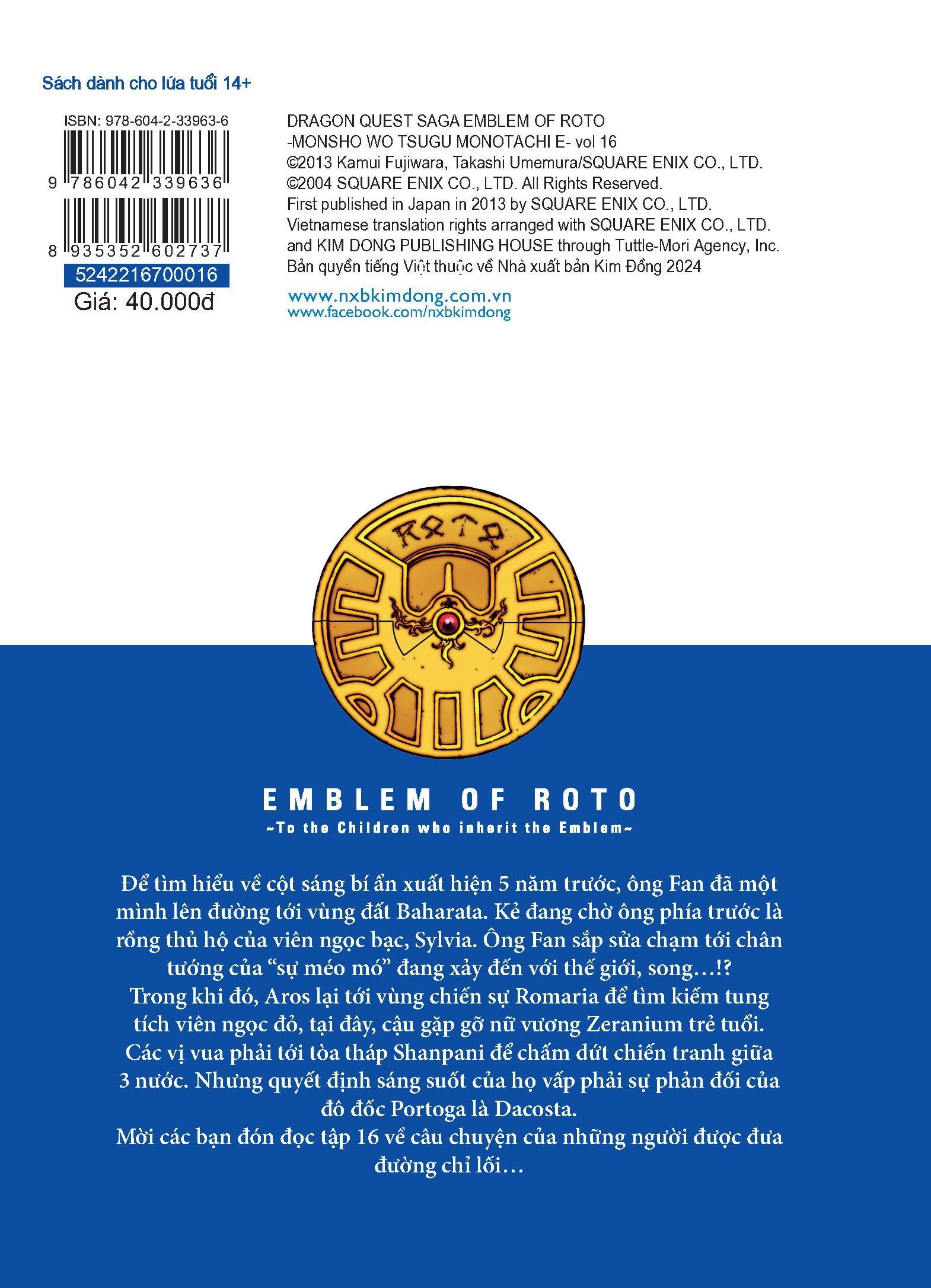 Mua tại TiktokDragon Quest - Dấu Ấn Roto - Những Người Kế Thừa - Tập 16 Để tìm hiểu về cột sáng bí ẩn xuất hiện 5 năm trước, ông Fan đã một m.ình lên đường tới vùng đất Baharata. Kẻ đang chờ ông phía trước là rồng thủ hộ của viên ngọc bạc, Sylvia. Ông Fan sắp sửa chạm tới chân tướng của “sự méo mó” đang xảy đến với thế giới, song…!? Trong khi đó, Aros lại tới vùng chiến sự Romaria để tìm kiếm tung tích viên ngọc đỏ, tại đây, cậu gặp gỡ nữ vương Zeranium trẻ tuổi. Các vị vua phải tới tòa tháp Shanpani để chấm dứt chiến tranh giữa 3 nước. Nhưng quyết định sáng suốt của họ vấp phải sự phản đối của đô đốc Portoga là Dacosta. Mời các bạn đón đọc tập 16 về câu chuyện của những người được đưa đường chỉ lối…