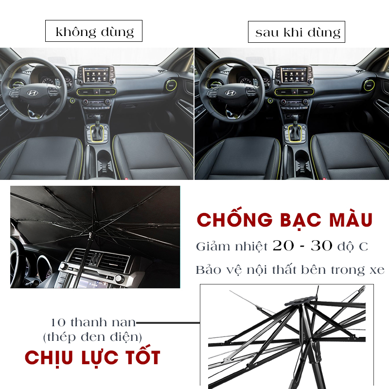 Mua tại TiktokChất liệu chống nắng BẠC titan + vải va đập PHẢN XẠ ÁNH NẮNG cực mạnh, ngăn chặn 98% tia UV hiệu quả. GIẢM NHIỆT 20 - 30 độ C, CHỐNG BẠC MÀU, hỏng hóc, bảo vệ nội thất trong xe, HẠN CHẾ BỐC MÙI, giúp không khí trong xe dễ chịu hơn. CẦM TAY, gấp gọn tiện lợi, BẤM NÚT tự động bung cúp dù trong 10s, dễ dàng sử dụng, cất giữ trong xe, mang đi mọi nơi. Thân dù cấu tạo từ thép đen điện siêu bền, chống lõm ô, không lật, không cong gãy. Thông minh, chất liệu vải dù chống thấm nước THAY THẾ DÙ khi trời mưa. TẶNG KÈM túi đựng bằng da cao cấp Thông Tin Chi Tiết