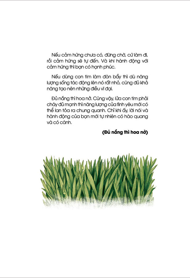 Đủ nắng thì hoa nở. Cũng vậy, lửa con tim phải cháy đủ mạnh thì năng lượng của tình yêu mới có thể lan tỏa ra chung quanh. Chỉ khi ấy, lời nói và hành động của bạn mới tự nhiên có hào quang và có cánh.