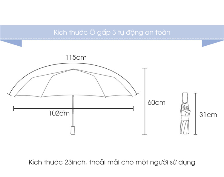 -Thiết kế sang trọng, nhỏ gọn. Kích thước khi gấp gọn chỉ 31x6x6cm, không cồng kềnh như những chiếc ô thông thường khác. Do đó rất tiện khi dễ dàng bỏ vào balo, túi xách. Bạn không còn phải lo lắng mỗi khi đi ra ngoài dù thời tiết nắng hay mưa bất chợt.