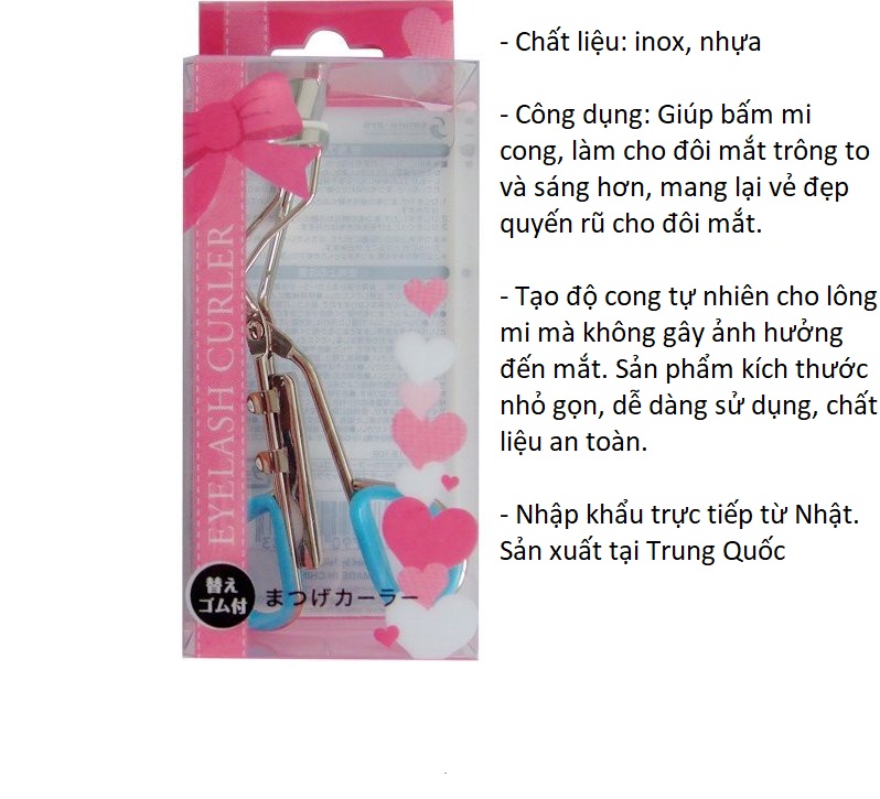 - Chất liệu: inox, nhựa - Kích thước: chiều dài 13cm, chiều rộng 4cm - Công dụng: Giúp bấm mi cong, làm cho đôi mắt trông to và sáng hơn, mang lại vẻ đẹp quyến