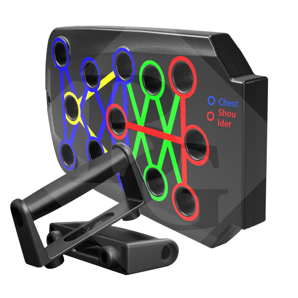 - Dụng cụ chống đẩy mã hóa màu khác nhau nhắm mục đích luyện tập thể dục cơ bắp cụ thể (đỏ cho vai, vàng cho lưng, xanh cho cơ tam đầu).