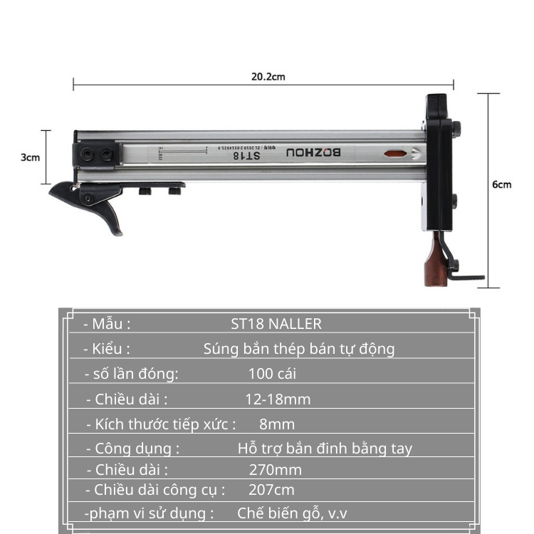 Mô hình: Máy đóng đinh bằng tay ST18 Kiểu: máy đóng đinh thép bán tự động Số lượng ràng buộc: 100 miếng Chiều dài móng: 12-18mm Tiếp quản kích thước: 8mm Chiều dài: 207mm Chiều