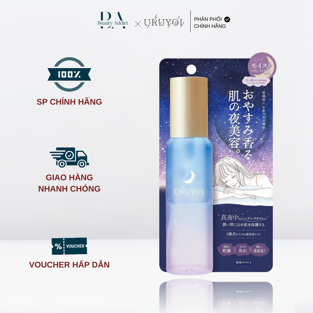 - URUYOI Night Repair Essence Moist phù hợp với da khô ráp, sần sùi và có tình trạng bị căng da, bong da. Sản phẩm cấp ẩm tối đa giúp da lấy lại độ mềm mịn và căng bóng, đồng thời giúp da đàn hồi hơn. HDSD: Sau khi kết thúc quá trình chăm sóc da trước, lắc chai theo chiều dọc khoảng 10 lần để hỗn hợp dầu và tinh chất hòa đều với nhau rồi xịt khoảng 2 lần bơm trực tiếp lên da. Vỗ nhẹ để tinh chất hòa quyện vào da. Lưu ý khi dùng hãy nhắm mắt và miệng, đồng thời không hít vào khi đang xịt tinh chất lên mặt. Lưu ý: không sử dụng trên da đang có triệu chứng bất thường như mẫn đỏ, dị ứng, mề đay, vết thương hở Bảo quản ở nhiệt độ thường và tránh ánh nắng trực tiếp, luôn giữ chai đứng thẳng tránh nghiêng để không bị rò rỉ. Do sự kết hợp của các thành phần tự nhiên nên trong quá trình sử dụng lâu dài có thể dẫn đến sự thay đổi về mùi hương và màu sắc nhưng không có vấn đề về chất lượng.