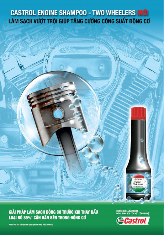 Mua tại TiktokĐiều kiện lái xe hiện đại khiến động cơ xe máy làm việc khắc nghiệt hơn, hình thành bụi bẩn và cặn bùn tích tụ bên trong động cơ. Nếu không được loại bỏ hoàn toàn khi thay dầu động cơ, các cặn bẩn này gây ảnh hưởng trực tiếp đến hoạt động của động cơ. Castrol Engine Shampoo - Two Wheelers là giải pháp súc rửa động cơ trước khi thay dầu, loại bỏ đến 85% cặn bẩn* bên trong động cơ, giúp làm sạch động cơ hiệu quả. Lợi điểm Làm sạch vượt trội giúp tăng cường công suất động cơ. Hướng dẫn sử dụng: Chuẩn bị: