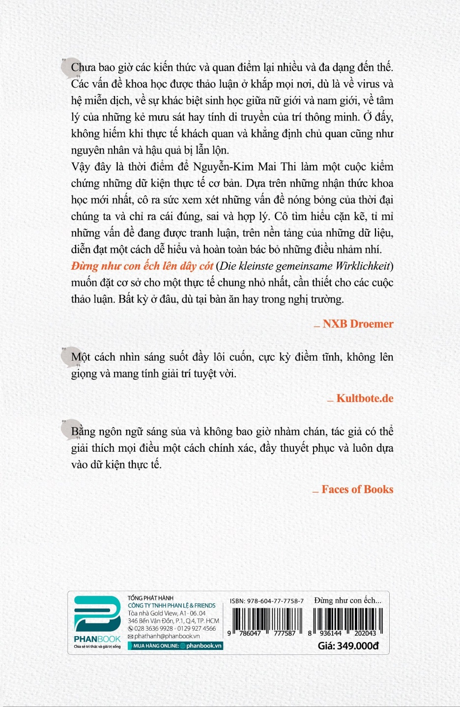 Đừng như con ếch lên dây cót là tập hợp các bài viết xoay quanh một số vấn đề gây tranh cãi hiện nay dưới góc nhìn khoa học: việc hợp pháp hóa ma-- t .úy, mối liên hệ giữa trò chơi điện tử và bạo lực, sự chênh lệch lương bổng theo giới tính, những huyền thoại về âm mưu của ngành dược phẩm và vai trò thật sự của y học thay thế, độ an toàn của vắc-xin, khả năng di truyền của trí thông minh, sự khác biệt não bộ giữa nam giới và nữ giới, câu hỏi đạo đức đối với những thử nghiệm trên động vật, đại dịch Corona và biến đổi khí hậu,