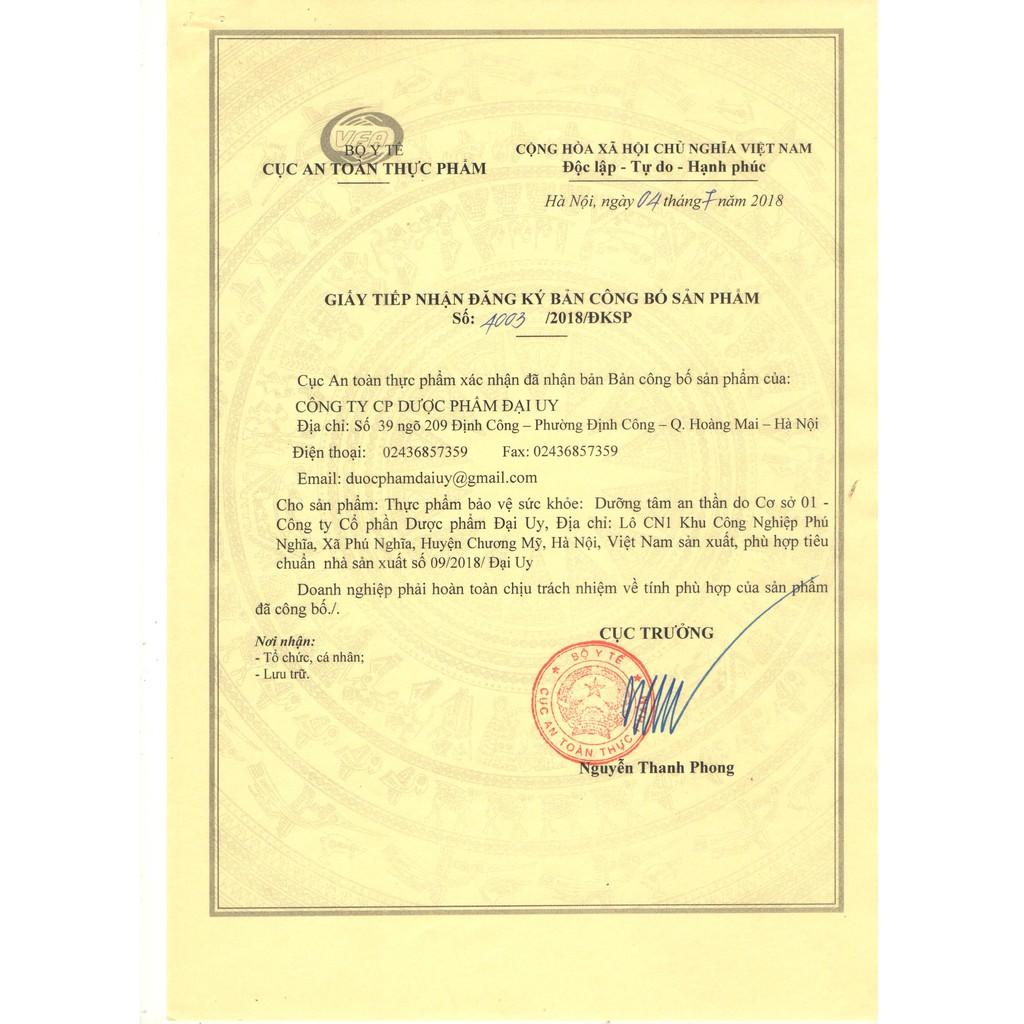 Dưỡng tâm an thần Đại Uy là sản phẩm của Công ty Cổ phần Dược phẩm Đại Uy là đơn vị với hơn 10 năm kinh nghiệm trong chế biến các loại thực phẩm bảo về sức khoẻ với dây chuyền sản xuất hiện đại, đội ngũ lao động lành nghề, sản phẩm được điều chế hoàn toàn từ thảo dược thiên nhiên, vô cùng an toàn và hoàn toàn lành tính, áp dụng công nghệ mới tại nhà máy đạt chuẩn GMP quốc tế đạt đầy đủ các chỉ tiêu trong và ngoài nước và luôn là sản phẩm được người dân trên khắp 63 tỉnh thành tin dùng trong suốt nhiều năm qua. Công dụng: Giúp dưỡng tâm an thần, hỗ trợ tạo giác ngủ sâu, ngủ ngon hơn Liều dùng: Ngày uống 4 viên chia 2 lần Đối tượng sử dụng: Dùng cho người lớn mất ngủ, ít ngủ, do suy nhược cơ thể hoặc bệnh lý, người giá khó ngủ Thành phần: