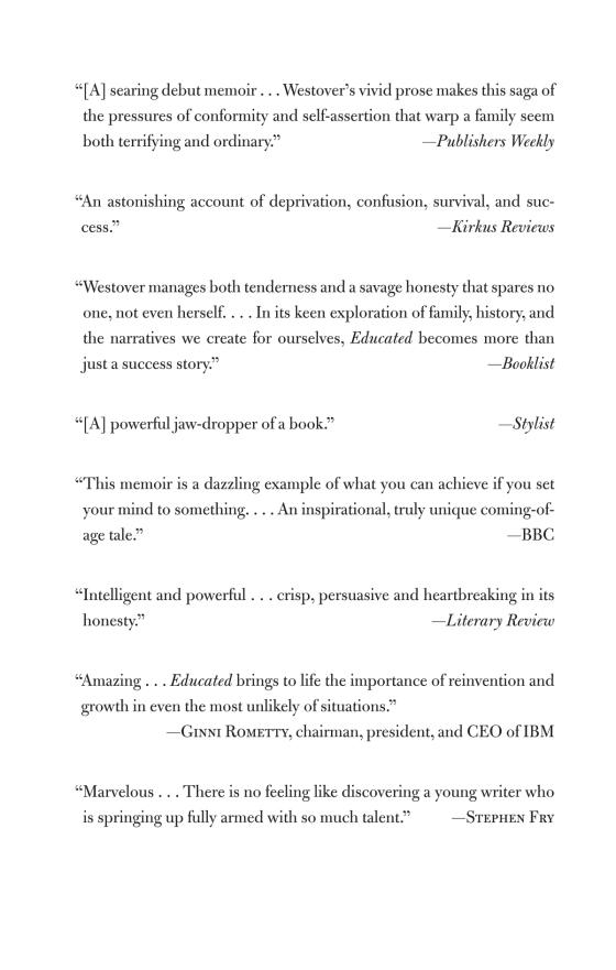 1 NEW YORK TIMES, WALL STREET JOURNAL, AND BOSTON GLOBE BESTSELLER - One of the most acclaimed books of our time: an unforgettable memoir about a young woman who, kept out of school, leaves her survivalist family and goes on to earn a PhD from Cambridge University