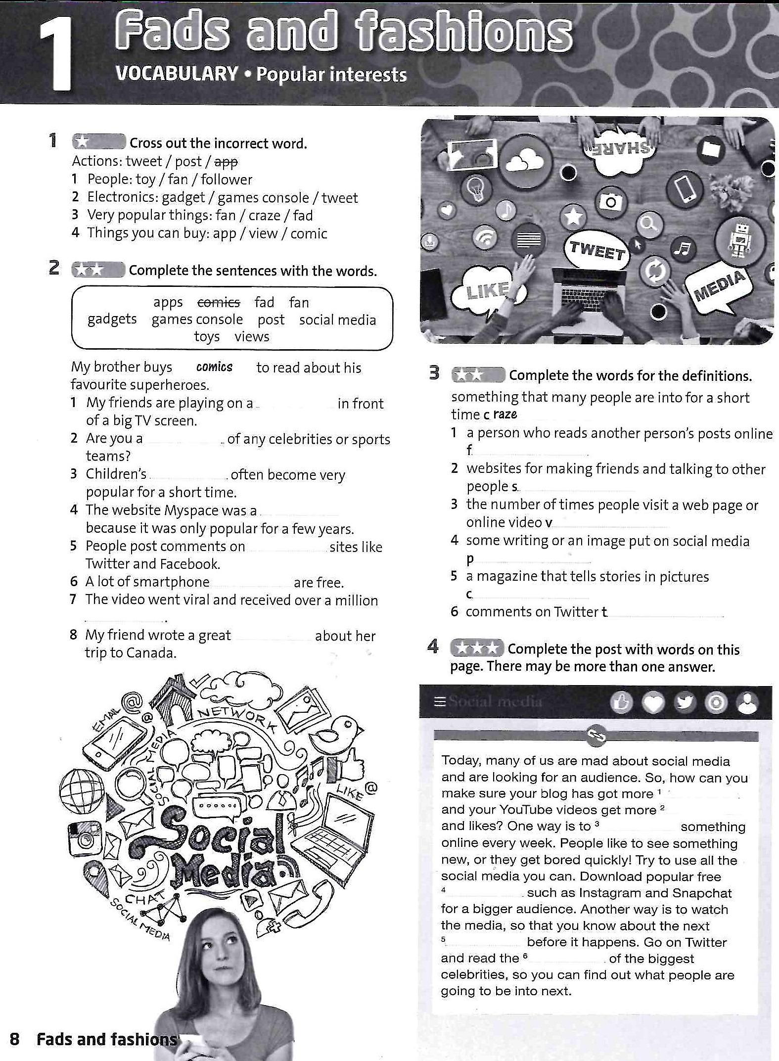 The Workbook includes exercises in grammar, vocabulary and skills, which mirror the language and skills work in the Student's Book pages. There are three levels of practice activities: one-star activities provide basic revision and language manipulation; two-star activities involve more productive exercises; and three-star activities are more open and offer more challenge. There is a two-page Progress review at the end of each unit. These exercises check understanding of all the vocabulary, grammar and skills presented in the unit. They also provide a record of what has been learned in the unit. The Self-evaluation section encourages students to think about their progress. This type of activity is also very helpful in students' development as learners because it encourages them to take responsibility for their own learning. There is a listening exercise in every Progress review. The audio for this is available on the online Practice Kit.