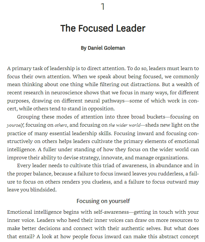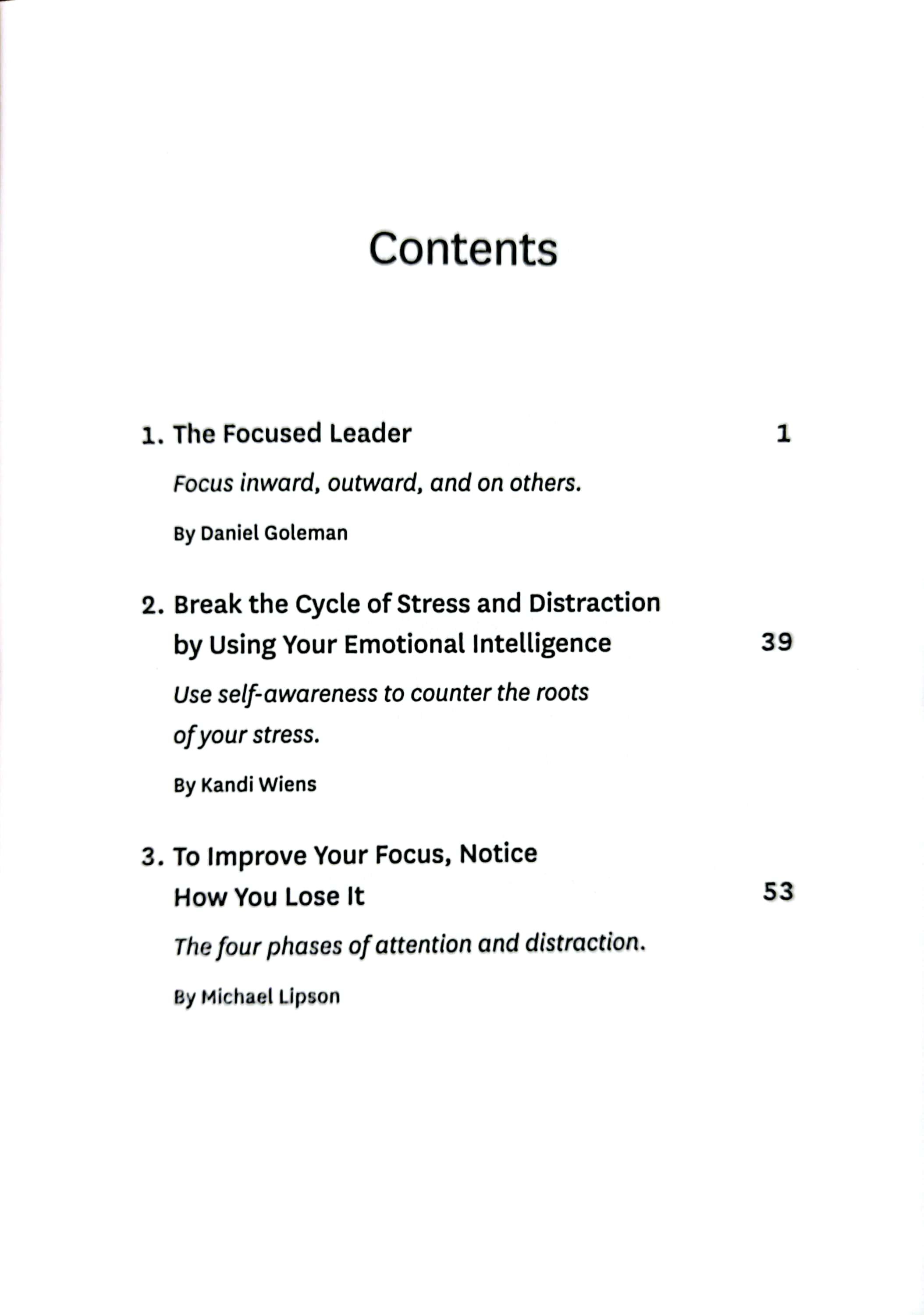 Focus (HBR Emotional Intelligence Series)   The importance of achieving focus goes well beyond your own productivity. Deep focus allows you to lead others successfully, find clarity amid uncertainty, and heighten your sense of professional fulfillment.