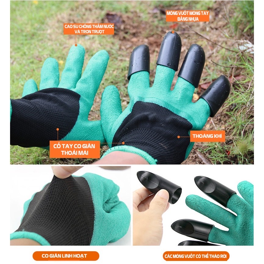 Bao tay làm vườn có móng vuốt để cào ,bới đất ,chăm sóc cây , chống thấm nước , bảo vệ tay khỏi đất bẩn ,các hóa chất từ phân bón , thuốc trừ sâu , diệt cỏ tránh tổn thương do va chạm với vật sắc nhọn , cành cây, co giãn đàn hồi tốt , dễ vệ sinh -Bao tay làm vườn có móng vuốt để cào ,bới đất ,chăm sóc cây , chống thấm nước , bảo vệ tay khỏi đất bẩn ,các hóa chất từ phân bón , thuốc trừ sâu