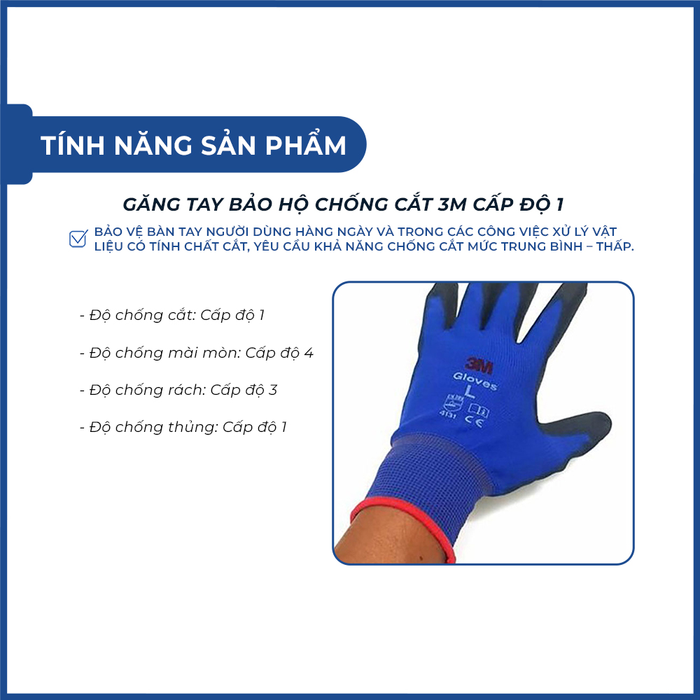 Găng tay chống cắt 3M cấp độ 1 là loại găng tay bảo hộ cơ bản, được thiết kế để bảo vệ tay khỏi trầy xước, va chạm nhẹ và cắt nhẹ trong môi trường