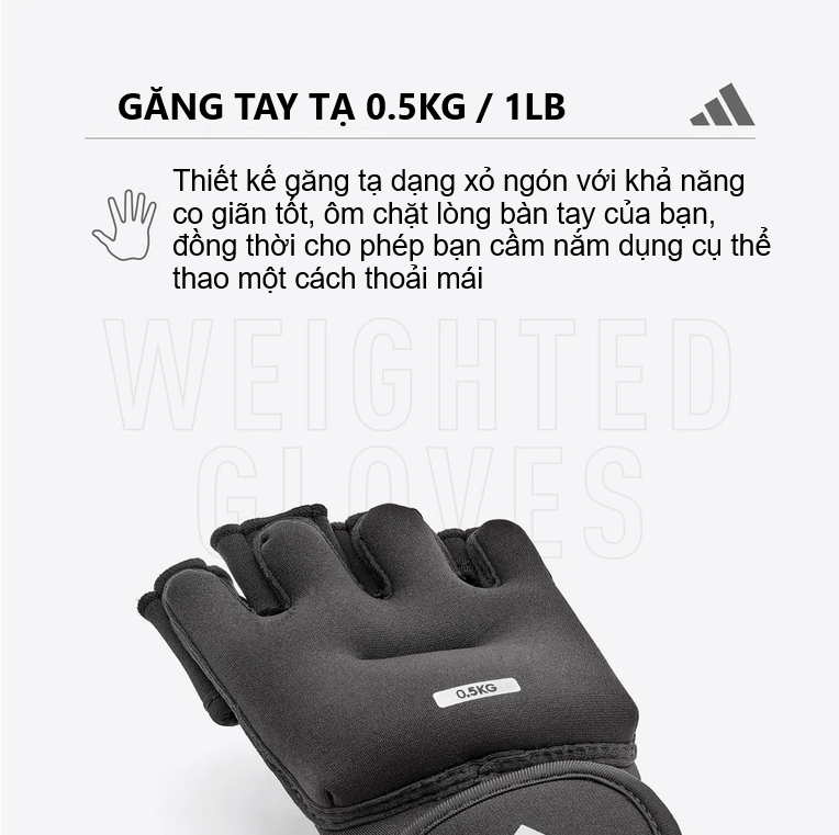 - Găng tạ ADIDAS 0,5KG ADWT-10702 có trọng lượng 0,5kg cho mỗi bên găng tay giúp hỗ trợ, tăng cường độ luyện tập của bạn.