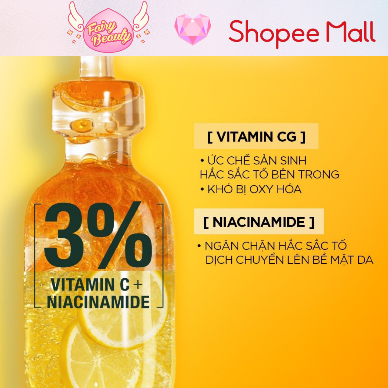 - Hạn sử dụng (EXP): 36 tháng GIỚI THIỆU THƯƠNG HIỆU GIỚI THIỆU SẢN PHẨM • Tinh Chất Vitamin C Cô Đặc Giúp Sáng Da Và Mờ Thâm Hiệu Quả Bright Complete VitaminC Ampoule kết hợp với thành phần chiết xuất 100% từ thực vật, sản phẩm chứa Vitamin Cg giúp chống oxy hóa. • Đặc biệt hiệu quả khi còn kết hợp cùng Niacinamide giúp tăng cường độ sáng cho da và mờ thâm quầng mắt, thâm mụn. ƯU ĐIỂM NỔI BẬT • Giúp sáng da, mờ thâm nám tức thì. • Về bao bì sản phẩm; quy trình sản xuất, sản phẩm là một bước tiến vững chắc từ Garnier trong quá trình hành động "Vì một thế hệ làm đẹp xanh". THÀNH PHẦN VÀ LOẠI DA PHÙ HỢP • Vitamin Cg 1.2%: