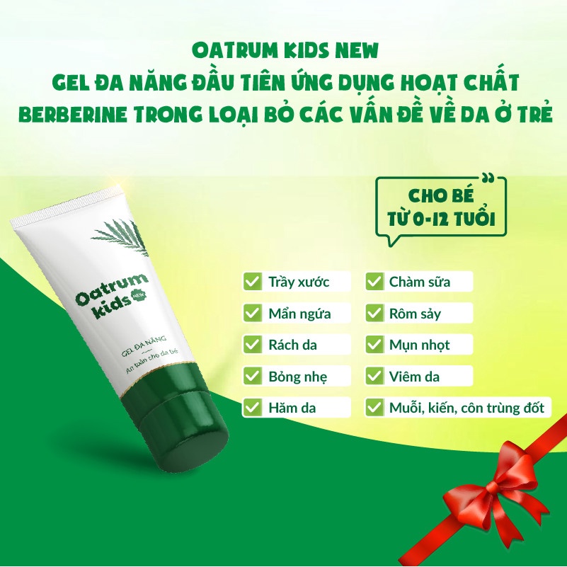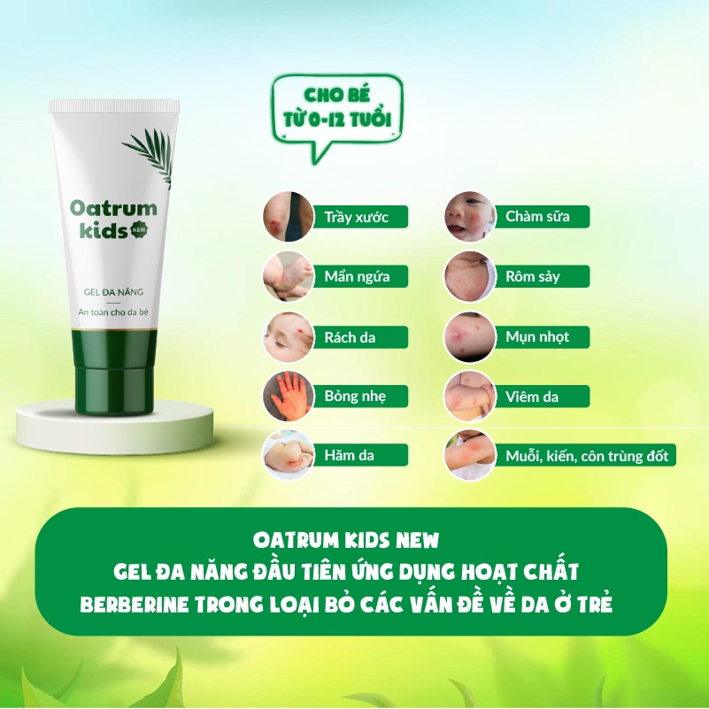 Gel bôi da Oatrum Kids New - bé hết trầy xước, rách da, bỏng, côn trùng đốt, hăm, mụn, viêm da, chàm sữaTHÀNH PHẦN:- Hoạt chất chính: Berberine, Nano Curcumin- Tá dược: Glycerin, Isopropyl Alcoho...
