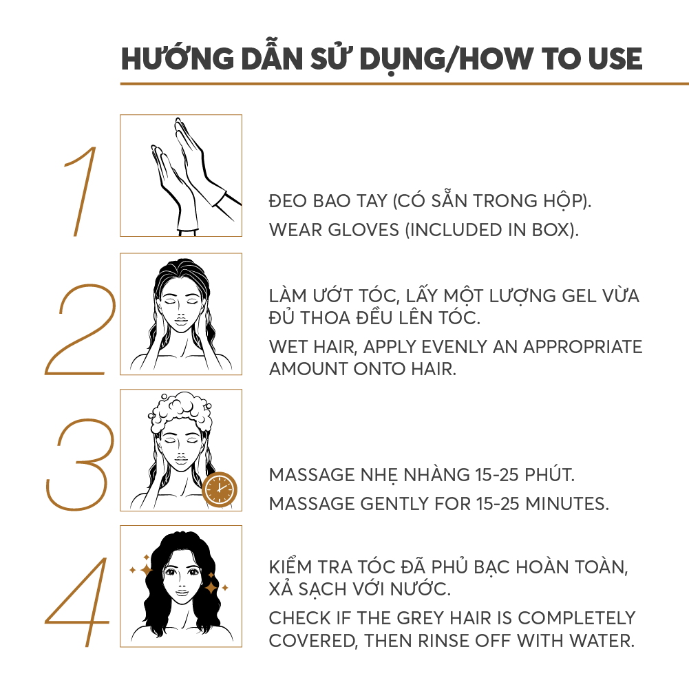 - Món quà rất thiết thực cho Ông Bà, Cha Mẹ và những người thân yêu. Hướng dẫn sử dụng Gel gội phủ bạc Flash Sản phẩm được nghiên cứu để thuận tiện cho việc sử dụng. Chính vì vậy các bước sử dụng cũng rất đơn giản và dễ dàng: Bước 1: Đeo bao tay (có sẵn trong hộp). Bước 2: Làm ướt tóc, lấy một lượng vừa đủ thoa đều lên tóc. Bước 3: Massage nhẹ nhàng 15-25 phút. Bước 4: Kiểm tra tóc đã phủ bạc hoàn toàn, xả sạch với nước. *Không cần gội lại bằng dầu gội. Chỉ cần gội 1 lần là tóc đã hết bạc, vì vậy bạn không cần sử dụng mỗi ngày. Mỗi tháng chỉ cần sử dụng Gel gội phủ bạc Flash từ 1 – 2 lần. Những ngày khác bạn vẫn dùng dầu gội làm sạch hàng ngày bình thường. Lưu ý: