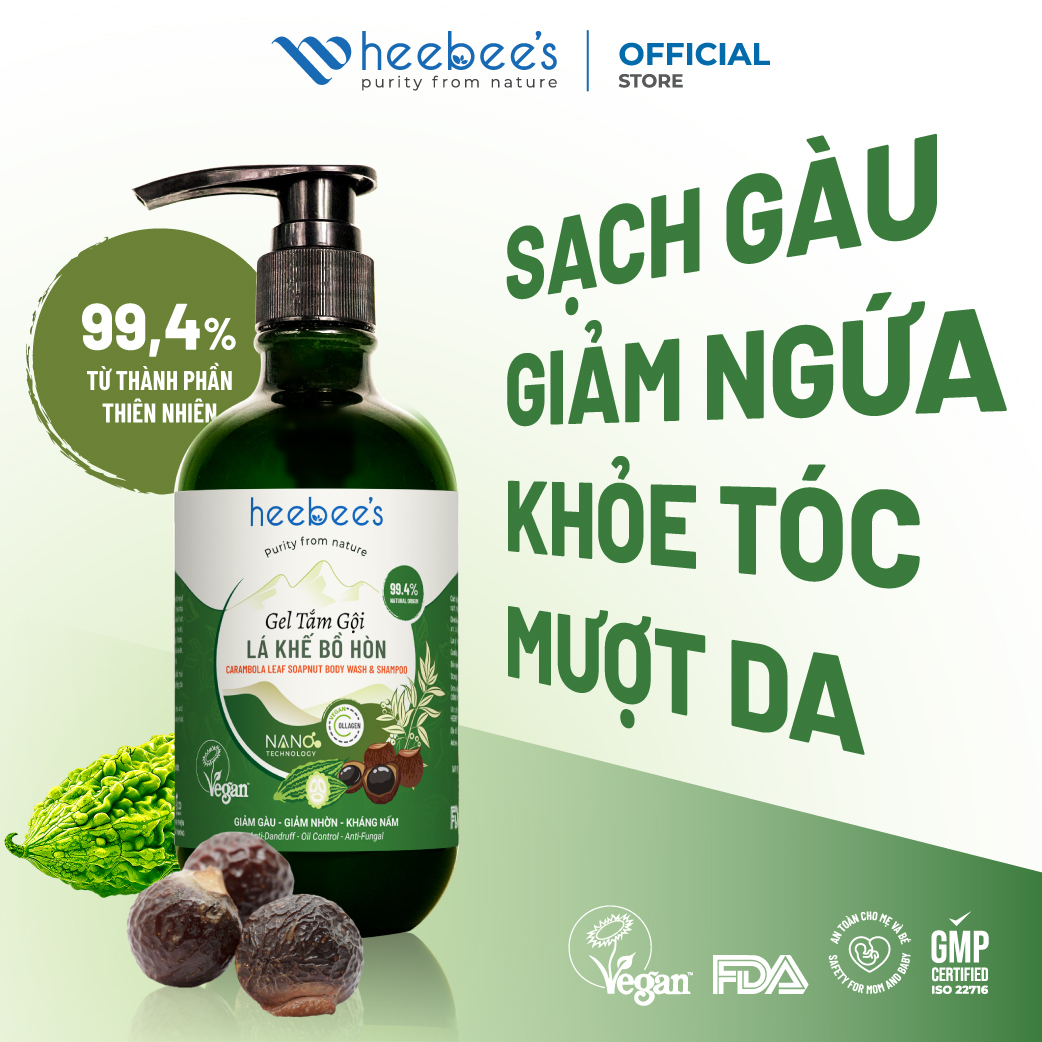 GEL TẮM GỘI LÁ KHẾ BỒ HÒN HEEBEE'S GIẢM GÀU, GIẢM NHỜN, KHÁNG NẤM 300ML - 500ML ĐIỂM NỔI BẬT Gel Tắm Gội Lá Khế Bồ Hòn 2in1 – giải pháp “Sạch sâu - Dưỡng sâu” thuần chay từ Lab Heebee, thiết kế riêng cho làn da nhạy cảm, đang gặp vấn đề như nấm, viêm da cơ địa, mụn hay rôm sảy. Kết hợp hệ chiết xuất thảo dược giàu tính Đông Y (Bồ Hòn, Lá Khế, Khổ Qua Rừng), công nghệ GreenSoap & Green-Antibiotic, cùng Collagen Nấm Tuyết & Vitamin B5 trên nền nước Hydrosol Vetiver tinh khiết. Sản phẩm không chỉ làm sạch sâu và lành tính mà còn tái tạo hàng rào bảo vệ da – cân bằng hệ vi sinh, giảm ngứa, bong tróc và khô sần. An toàn cho cả gia đình – từ mẹ bầu đến trẻ nhỏ, hướng đến lối sống “Thuần Xanh – Chuẩn Lành” bền vững từ bên trong. THÀNH PHẦN CHÍNH ĐIỀU GÌ KHIẾN GEL TẮM GỘI LÁ KHẾ BỒ HÒN HEEBEE'S KHÁC BIỆT? CAM KẾT SẢN PHẨM CÔNG DỤNG ‣ Làm sạch sâu, không khô căng, không kích ứng – loại bỏ bụi bẩn, dầu thừa, mùi cơ thể và vi khuẩn gây viêm da ‣ Kháng khuẩn – kháng nấm – giảm ngứa rõ rệt – hỗ trợ cải thiện tình trạng mẩn đỏ, gàu, nấm, viêm da cơ địa, vảy nến ‣ Nuôi dưỡng da đầu khỏe mạnh, giảm gãy rụng, kích thích mọc tóc ‣ Dưỡng ẩm, làm mềm, củng cố hàng rào bảo vệ tự nhiên của da ĐỐI TƯỢNG SỬ DỤNG ‣ Phù hợp cho mọi loại da, tóc, lứa tuổi và giới tính ‣ Dịu nhẹ với da nhạy cảm, da khô sần, da dầu nhờn hay dễ kích ứng ‣ Thích hợp cho tóc mỏng yếu, hư tổn, da đầu gàu, nhờn, dễ bết ‣ An toàn cho phụ nữ mang thai, sau sinh, trẻ nhỏ và người có bệnh lý mãn tính cần sản phẩm chăm sóc thuần tự nhiên mỗi ngày ‣ Đặc biệt phù hợp với người đang gặp các vấn đề da liễu như viêm da, vảy nến, mụn, rôm sẩy, cần giải pháp sạch lành – không hóa chất gây hại CÁCH SỬ DỤNG Gội đầu: ‣ Làm ướt tóc, tạo bọt sản phẩm với nước rồi thoa đều lên tóc và da đầu. ‣ Massage nhẹ nhàng từ gốc đến ngọn trong 2–3 phút để làm sạch và nuôi dưỡng sâu, sau đó xả sạch. ‣ Với tóc dày, tóc dài, nhiều dầu hoặc đang gặp vấn đề da đầu, nên lặp lại bước gội 2–3 lần để đạt hiệu quả tối ưu. Tắm cơ thể: