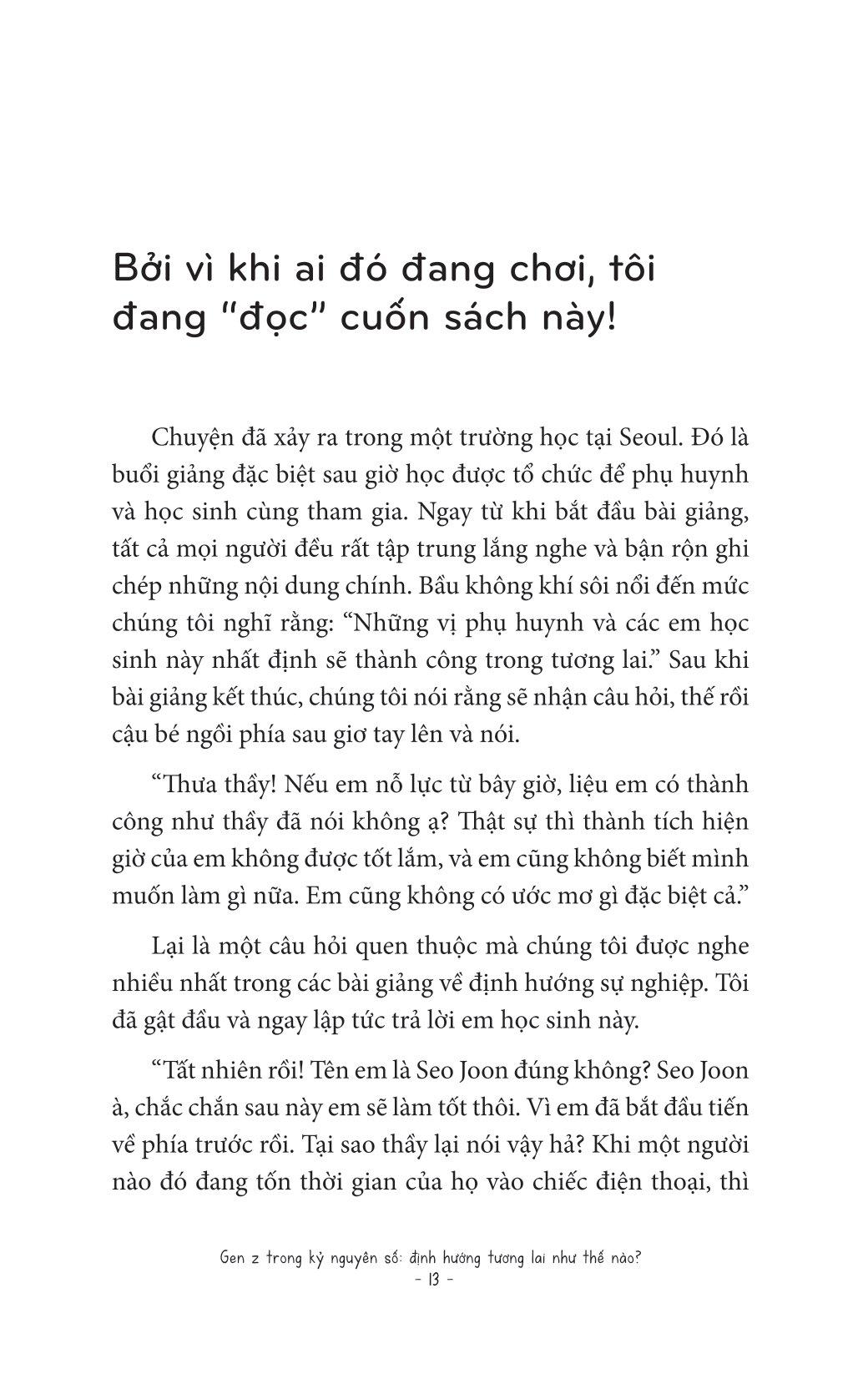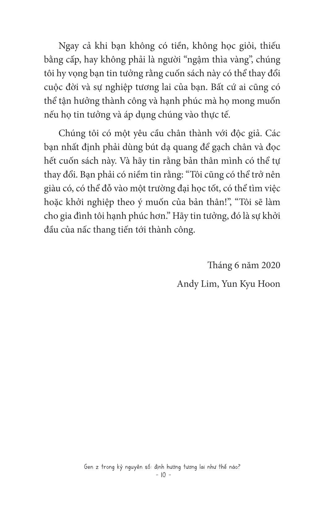 Trong cuốn sách Gen Z trong kỷ nguyên số: Định hướng tương lai như thế nào?, tác giả Yun Kyu Hoon thông qua những cuộc nói chuyện với hơn 330.000 thanh thiếu niên tại các trường trung học sẽ chỉ cho bạn thấy cách làm thế nào để vạch ra một con đường sự nghiệp tương lai đúng đắn dù bạn đã có đam mê hay chưa tìm ra. Việc định hướng này rất quan trọng, đặc biệt trong tình hình cả thế giới đang đối mặt với đại dịch covid và sự thay đổi chóng mặt do nền công nghiệp 4.0 mang lại. Những tư duy nào nên có, những nghề nghiệp nào nên được ưu tiên, những kỹ năng nào cần đào sâất cả đều đang chờ bạn lật mở cuốn sách này để khám phá.