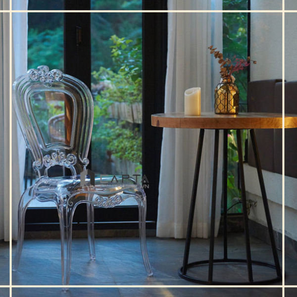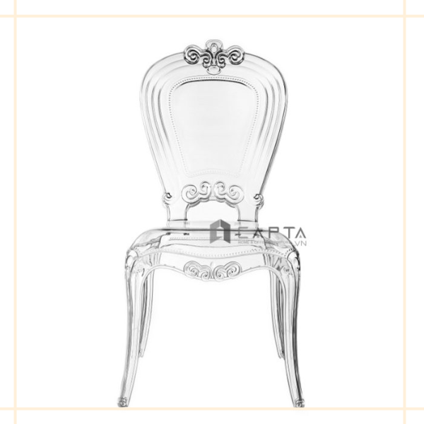 Lưng ghế và phía trước phần mặt ngồi điểm xuyến họa tiết uốn lượn mềm mại. Đường nét tổng thể bo cong gợi lên sự lãng mạn và tinh xảo. Chất liệu nhựa PC cứng chắc, bền bỉ, thoải mái sử dụng ngoài ban công hoặc bố trí khu vực cạnh cửa sổ. Màu trắng trong tạo chiều sâu không gian.