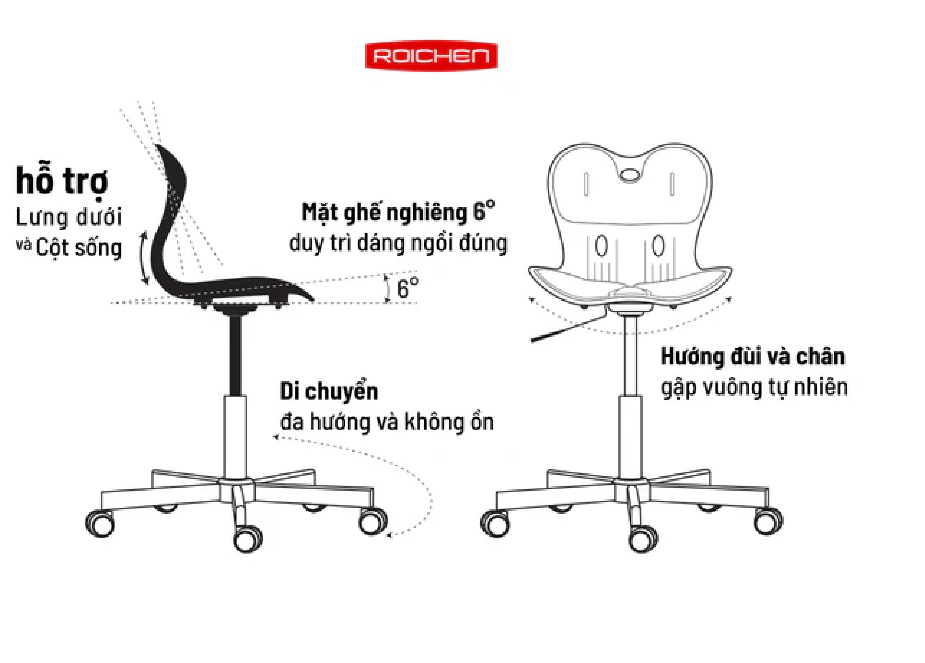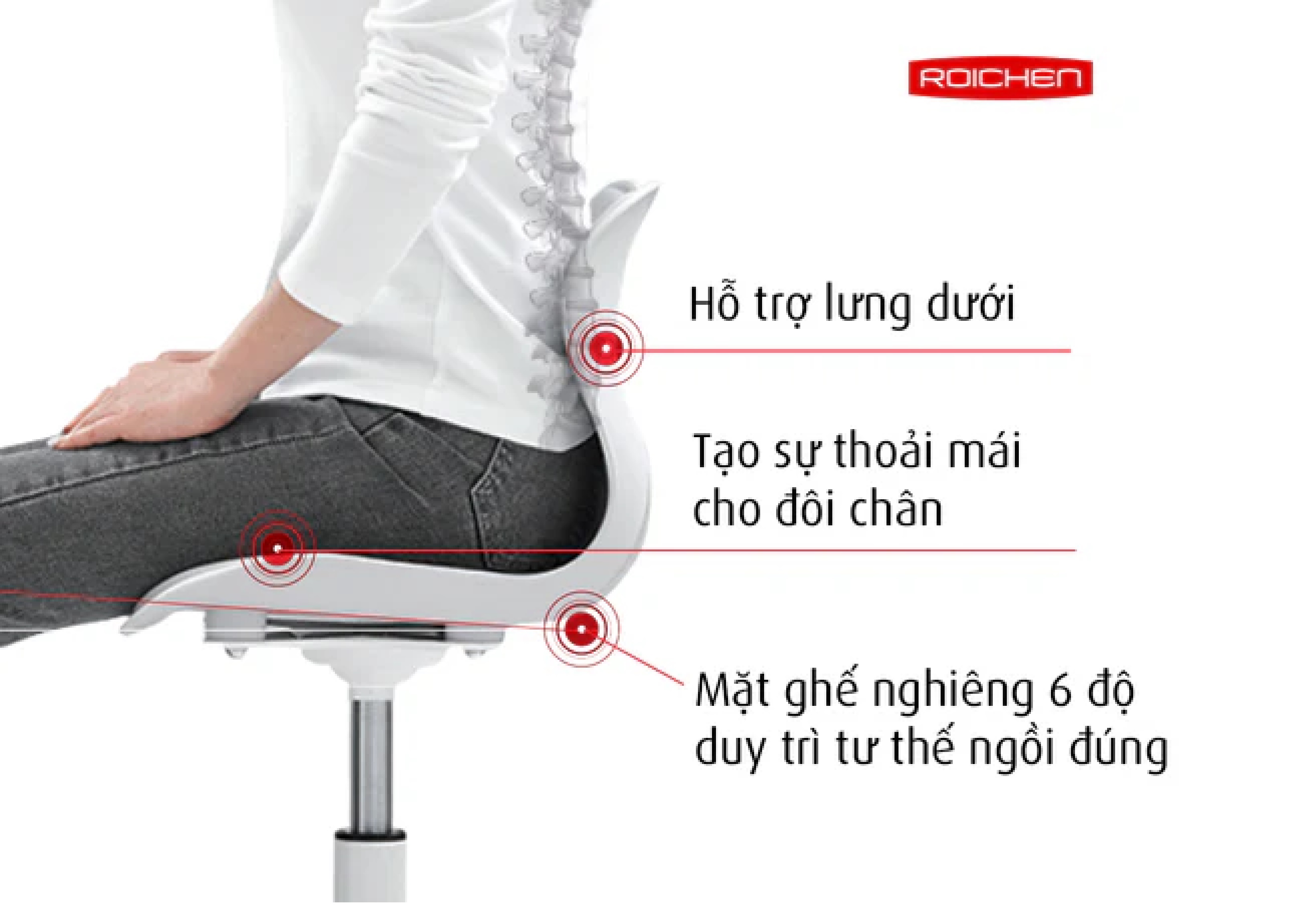 Ghế WOW chỉnh dáng ngồi đúng chân xoay từ thương hiệu Roichen Hàn Quốc được thiết kế giúp cho người dùng duy trì tư thế ngồi đúng một cách thoải mái, vững chãi, đưa cột sống quay trở về đường cong sinh lý. Điều này giúp ngăn ngừa các bệnh văn phòng do ngồi nhiều như đau lưng, cổ, vai, gáy...Hoặc thiếu tập trung khi học tập và làm việc do tư thế ngồi chưa đúng.