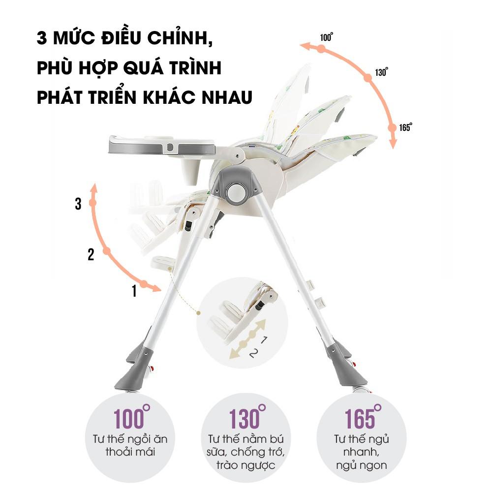 - 3 vị trí ngả ghế (110, 130, 155 độ) phù hợp với các tư thế ăn của trẻ: nằm uống sữa, nghiêng ăn bột, ngồi ăn dặm hoặc ngồi chơi