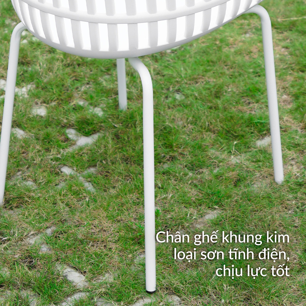 - Phần chân ghế bằng thép sơn tĩnh điện chắc chắn, có miếng lót cao su chống trơn trượt, giảm tiếng ồn, bảo vệ sàn nhà. Công dụng Ghế nhựa quán cà phê thích hợp sử dùng cả trong nhà lẫn ngoài sân vườn. Dùng trong nhà hàng, khách sạn, quán ăn, quán nước, ghế đọc sách, ghế ăn cơm, sân vườn, Lưu ý