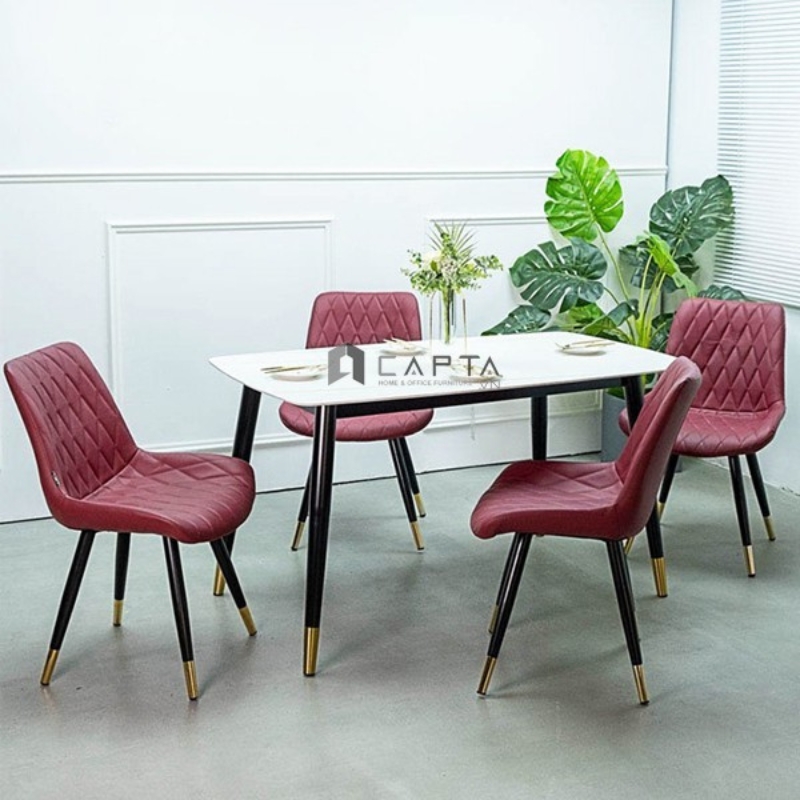 - Ghế Lux nệm PVC êm ái, 4 chân mạ ống đồng sang trọng phù hợp ghế ăn gia đình, ghế ăn nhà hàng, ghế làm việc tại nhà,… LUX 6C-P nằm trong dòng ghế ăn có nệm cao cấp sang trọng. Chất liệu nệm PVC êm ái, không thấm nước dễ dàng vệ sinh sạch sẽ bụi bẩn chỉ bằng khăn lau ẩm. Họa tiết ô chéo hình lưới trên thân và nệm ghế tạo điểm nhấn và tạo không gian thông khí so với bề mặt nhẵn tự nhiên. Diện tích bề mặt ngồi và lưng tựa rộng rãi đem lại cảm giác thoải mái khi ngồi. Thiết kế 4 chân ghế mạ ống đồng sang trọng cao cấp. Kết hợp với bàn ăn Sala với thiết kế chân đồng bộ tạo nên bộ bàn ăn mặt đá cao cấp 4 ghế sang trọng.