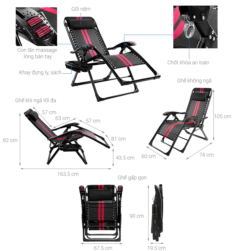 Ghế có kích thước sử dụng lớn 65× 180× 40cm để bạn nằm duỗi chân thoải mái, phù hợp với nhiều mục đích sử dụng như nằm nghe nhạc, đọc sách, ngủ trưa,