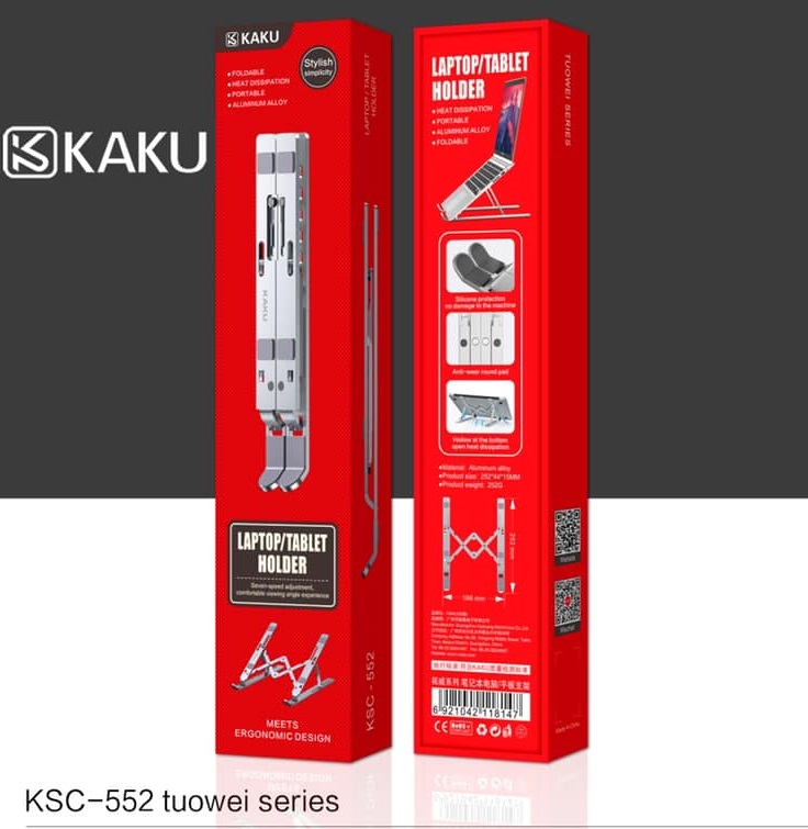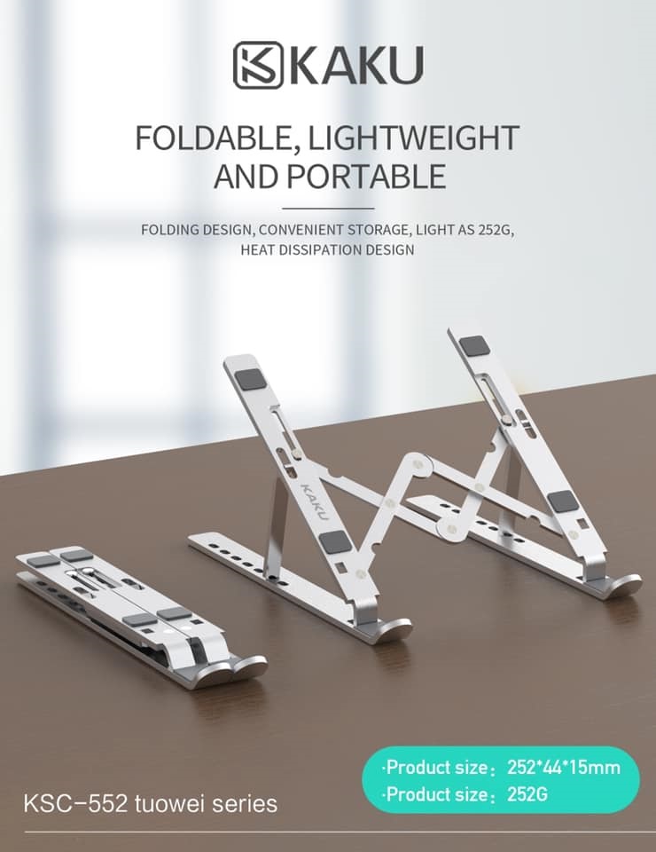 Giá đỡ đa năng chính hãng KAKU dành cho Macbook, iPad và các máy tính xách tay khác Chất liệu: hợp kim Nhôm (bền, đẹp, chắc chắn hơn nhựa rất nhiều) Các đầu tiếp xúc được gắn silicon êm mềm, không gây trầy xước máy Dùng để đỡ laptop các cỡ (13~15.6inch) và máy tính bảng Tương thích với hầu hết mọi Macbook/Laptop Gấp gọn khi không sử dụng có tính di động cao Linh hoạt tuỳ chỉnh độ cao theo nhiều cấp độ. Chống mỏi lưng, mỏi cổ, hạn chế các bệnh lý khi làm việc quá nhiều với máy tính. Khe thoáng giúp tản nhiệt laptop rất hiệu quả. Đệm cao su chống trơn trượt.