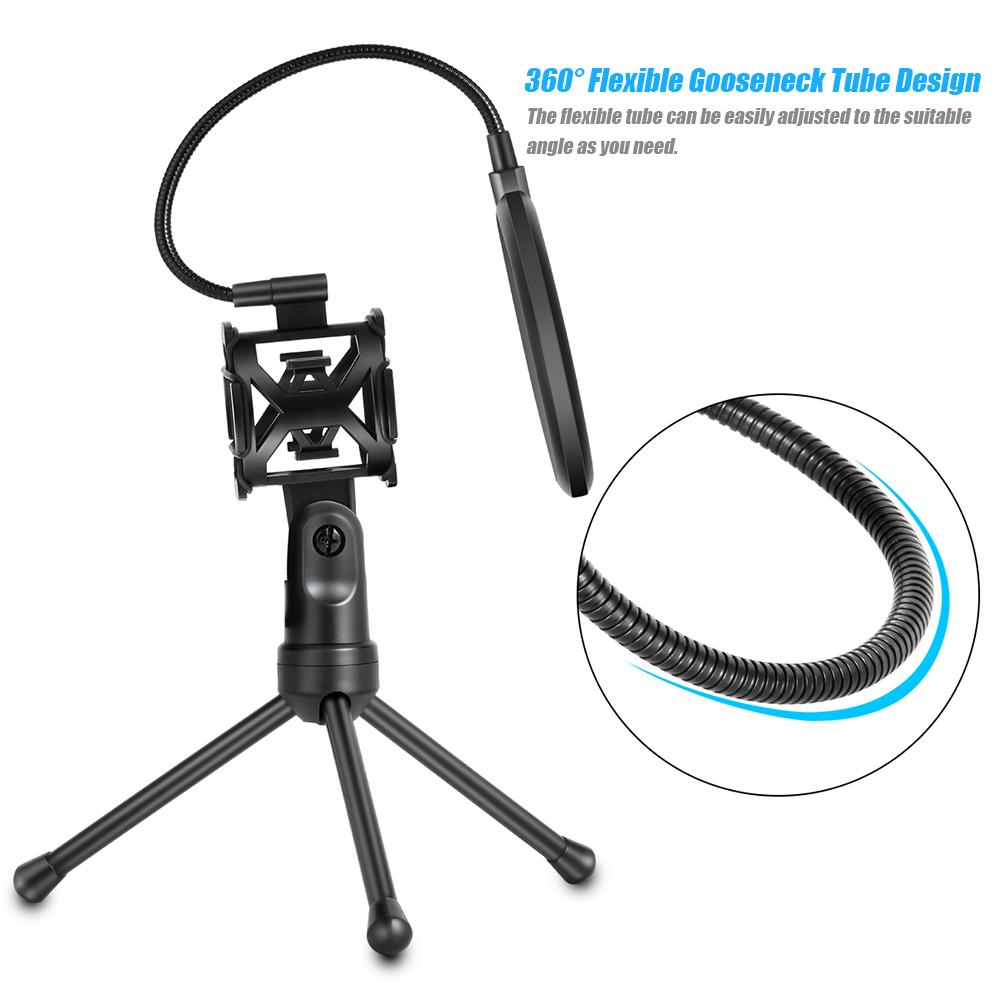 This is an professional mini P-OP filter shockproof microphone desktop stand for studio broadcasting, recording, singing, etc. Easy to install and use! Features: Professional desktop microphone tripod stand for broadcasting, podcasting, online meeting, singing, studio