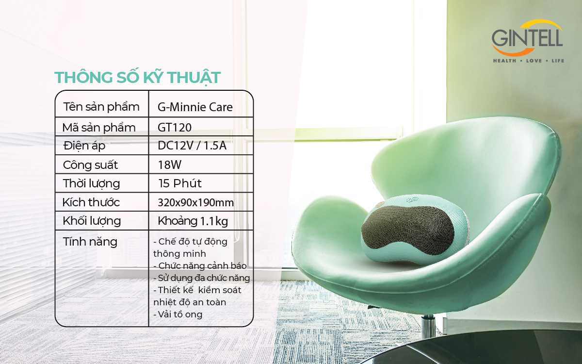 GỐI MASSAGE G-MINNIE CARE CHI TIẾT SẢN PHẨM - Tên sản phẩm: Gối Massage G-Minnie Care - Mã sản phẩm: GT120 - Thương hiệu: GINTELL - Bảo hành: 12 tháng 1 đổi 1 trong 7