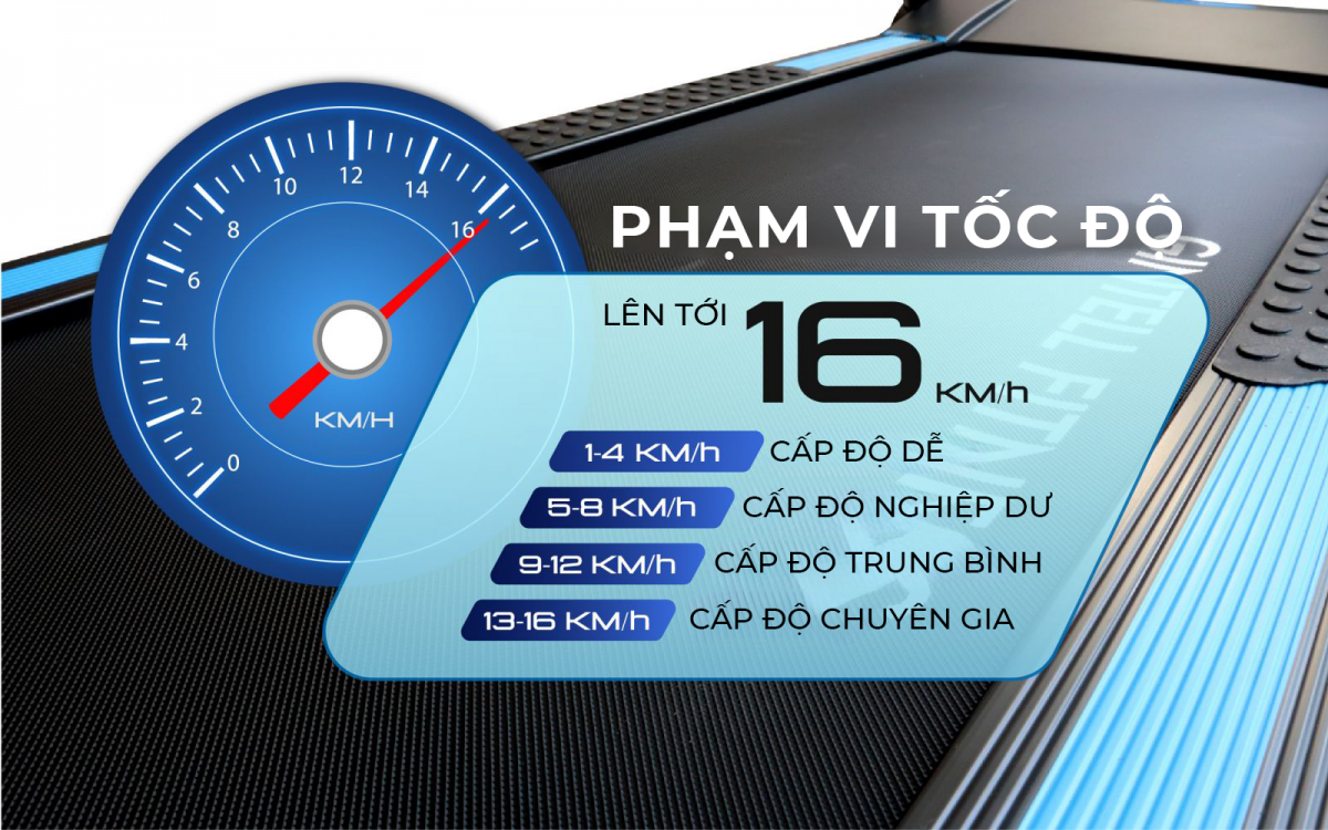 1. Tốc độ tối đa lên đến 16 km/h Với tốc độ tối đa lên đến 16 km/h, máy chạy bộ Smartrek Plus đáp ứng hầu hết nhu cầu luyện tập từ cơ bản đến nâng cao. Giúp cải thiện tốc độ chạy, tăng cường sức mạnh, thể lực và đốt cháy chất béo nhanh chóng bất cứ khi nào bạn muốn.