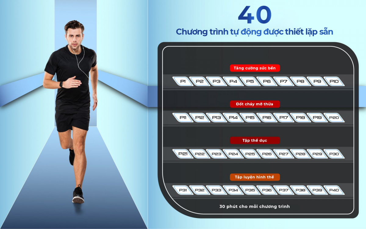 1. Tích hợp sẵn đến 40 chương trình tập luyện cùng 5 chế độ tùy chỉnh Máy chạy bộ GINTELL SmarTrek Plus, cài đặt sẵn 40 chương trình tự động, mỗi chương trình gồm 20 khoảng, thời gian chạy cho mỗi khoảng của một chương trình được phân bổ đều. Người dùng có thể cắt các chương trình theo nhu cầu cụ thể.