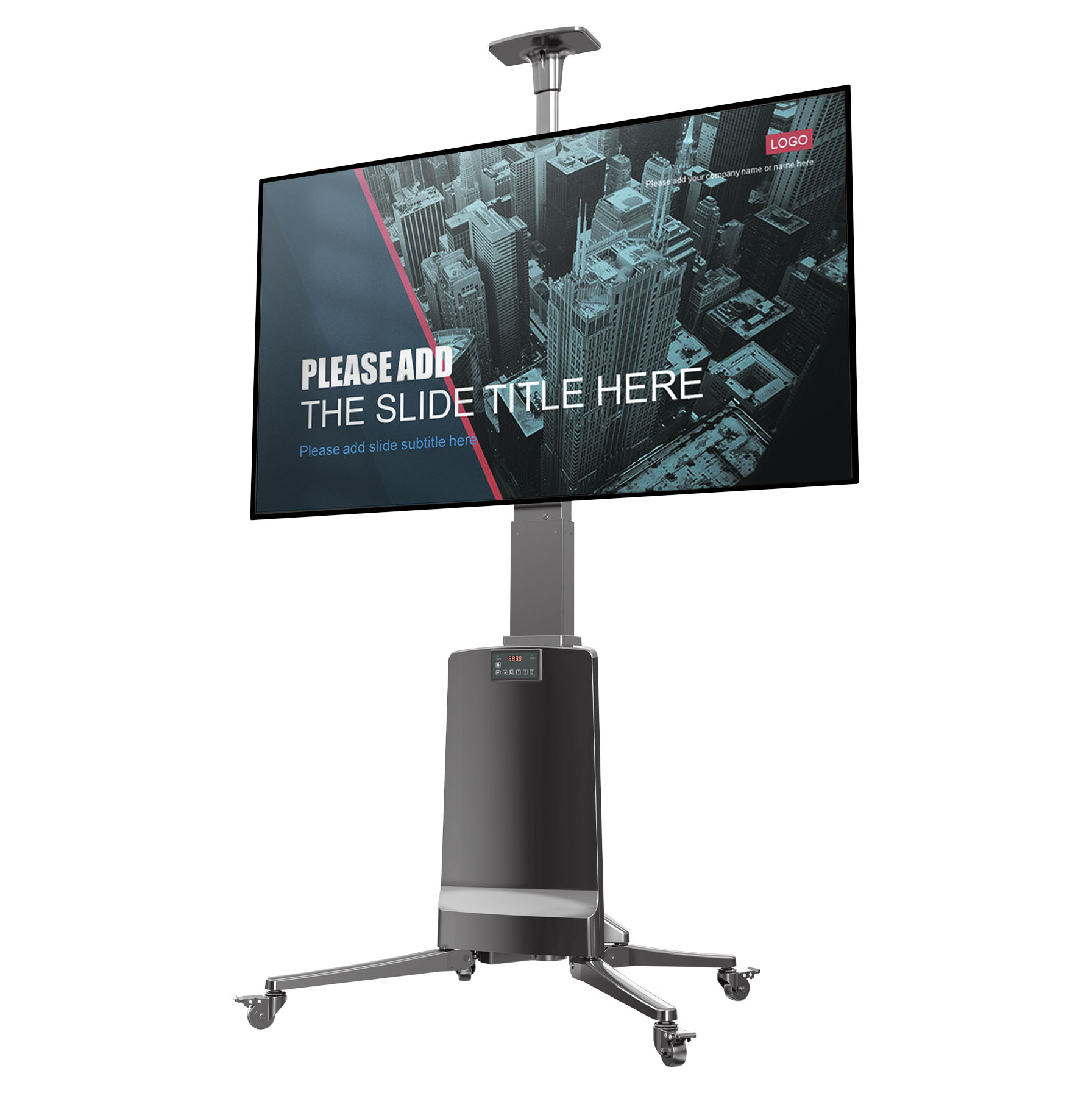 Được thiết kế rất tinh tế, tiện dụng và cơ động để có thể gắn tivi có trọng lượng tổng lên đến 68,2 kg, lắp được màn hình phẳng tử 55 inch đến 85 inch, với 4 bánh xe có chốt phanh đã được lắp đặt sẵn, nâng hạ không dây bằng Remote điện tử.