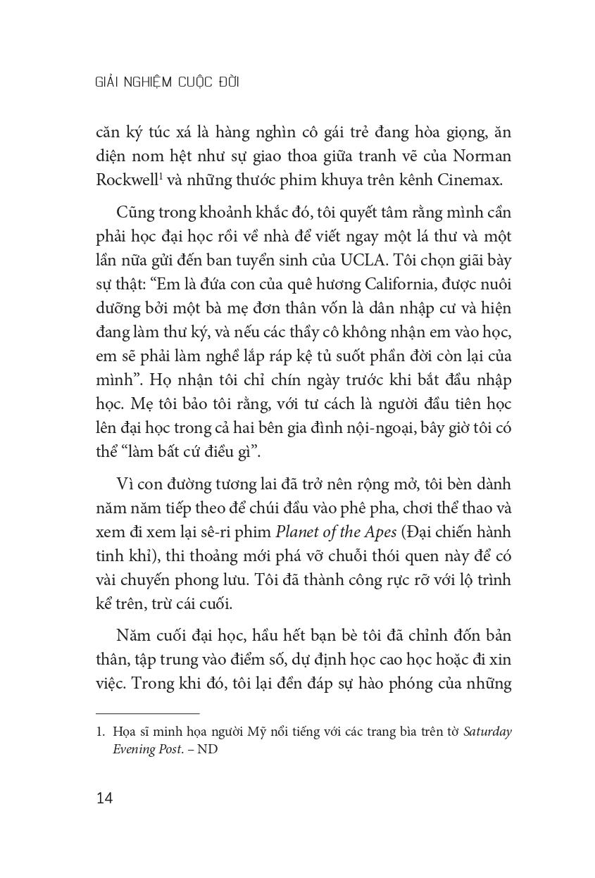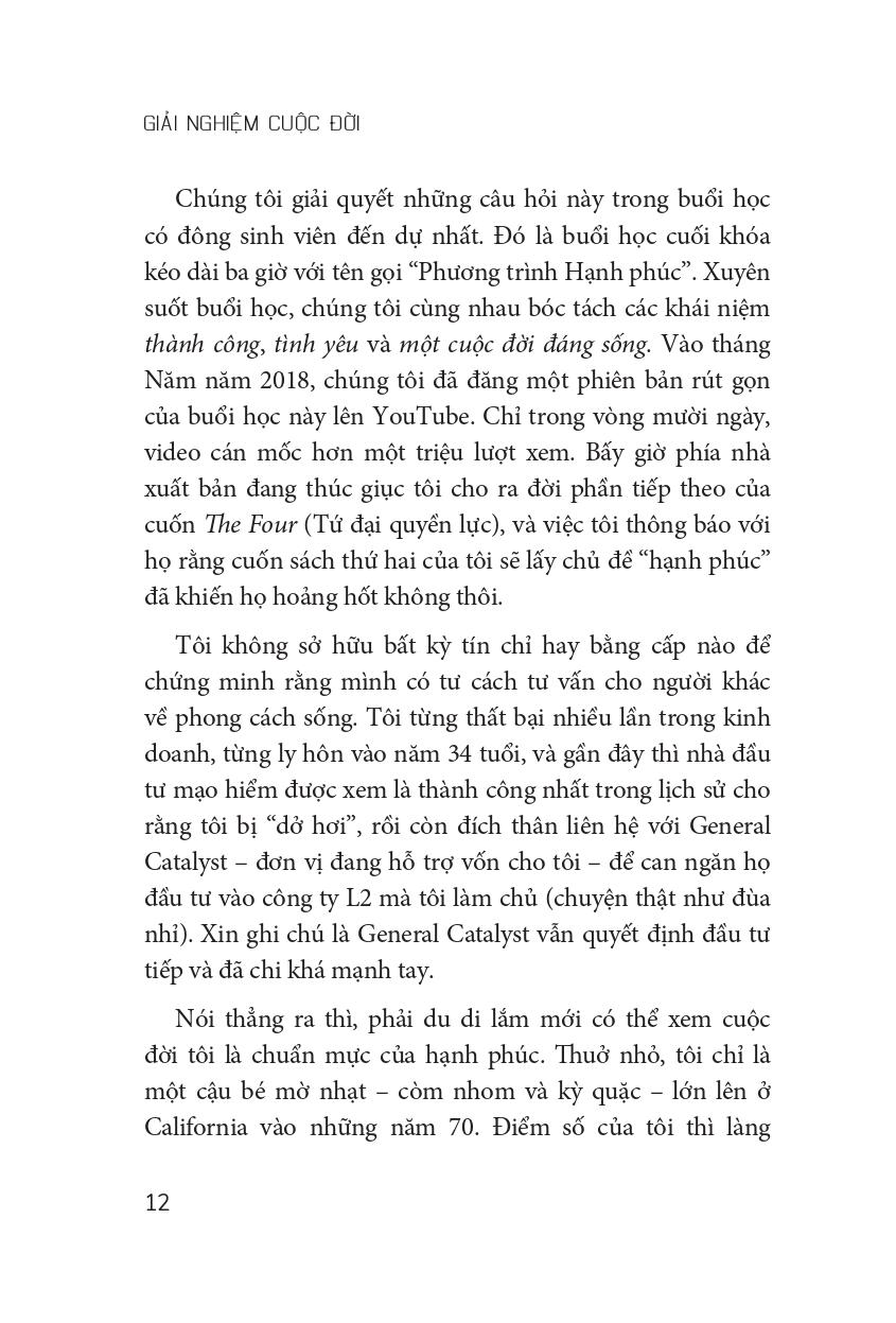Tác giả Scott Galloway trong cuốn sách “Giải nghiệm cuộc đời” đã chia sẻ quan sát của mình với tư cách một doanh nhân thành công với nhiều công ty khởi nghiệp, một nhà nghiên cứu, một người chồng, người cha cũng như một đứa con, và còn là một người đàn ông Mỹ. Ông đã tổ chức buổi học cuối khóa kéo dài ba giờ với tên gọi “Phương trình Hạnh phúc”. Xuyên suốt buổi học, ông đã bóc tách các khái niệm thành công, tình yêu và một cuộc đời đáng sống.
